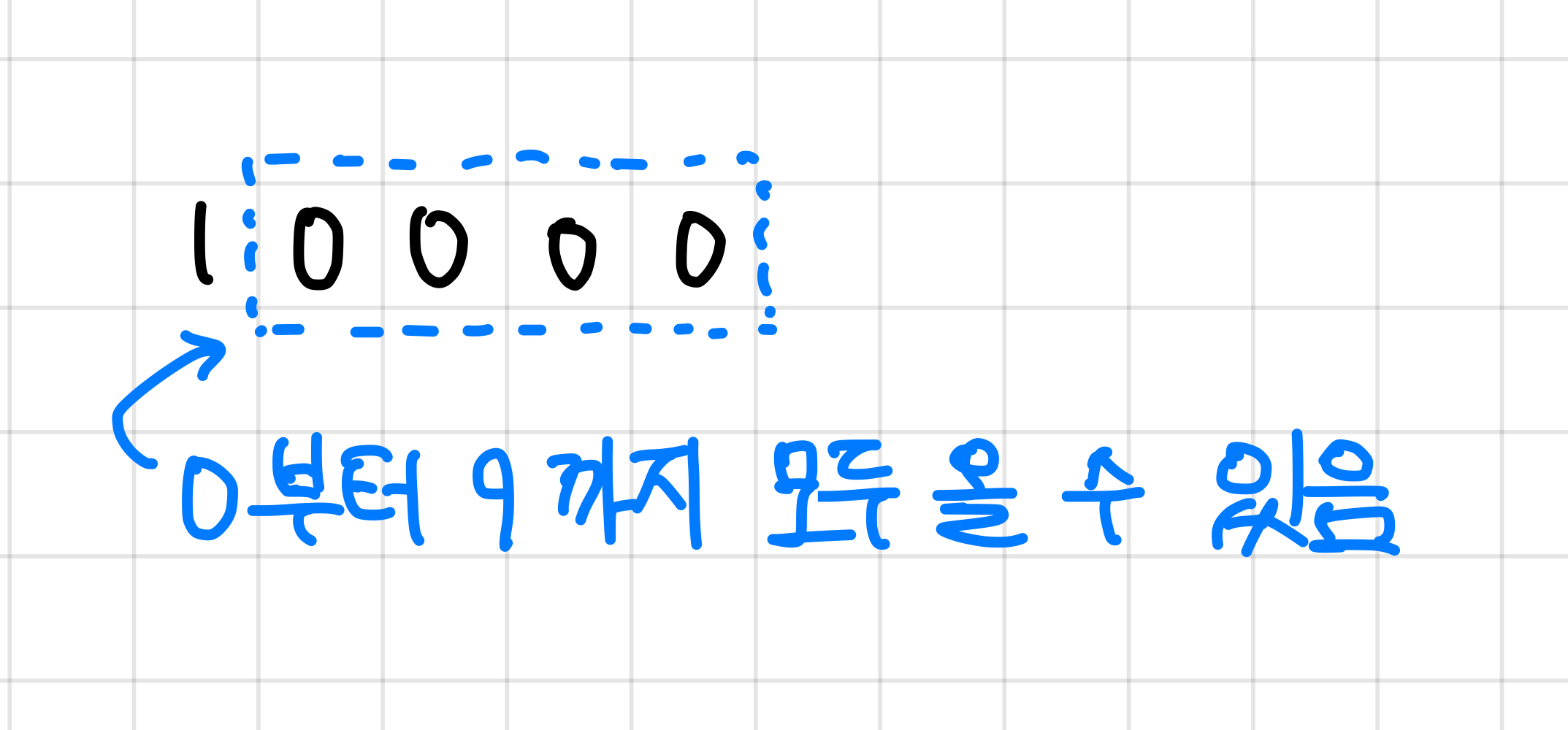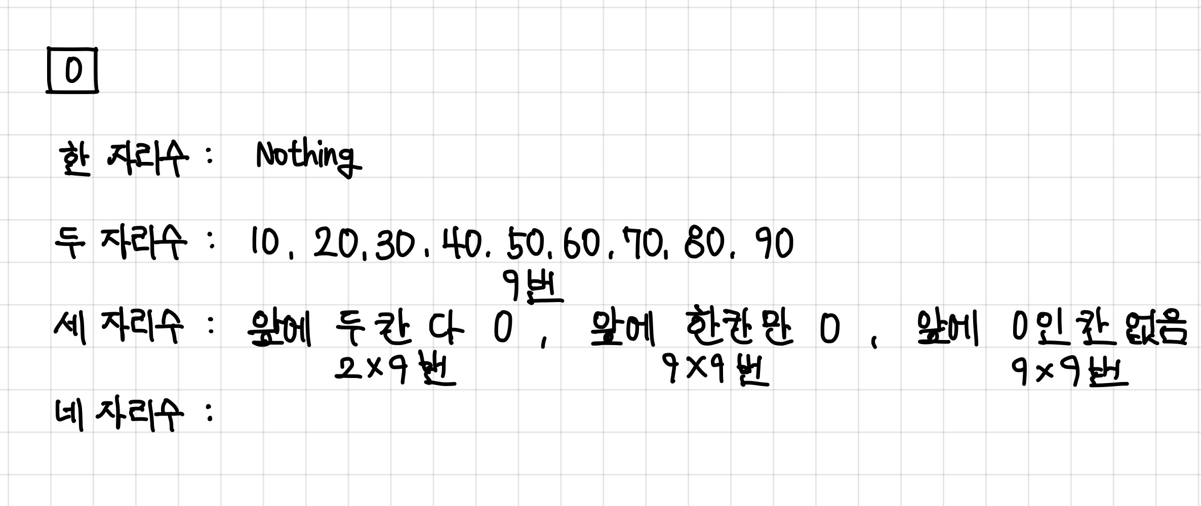 이미 저 앞에 0이 아닌 수가 앞자리를 대처하고 있어서, 뒷 자리 수들은 아무 숫자나 올 수 있다.▼