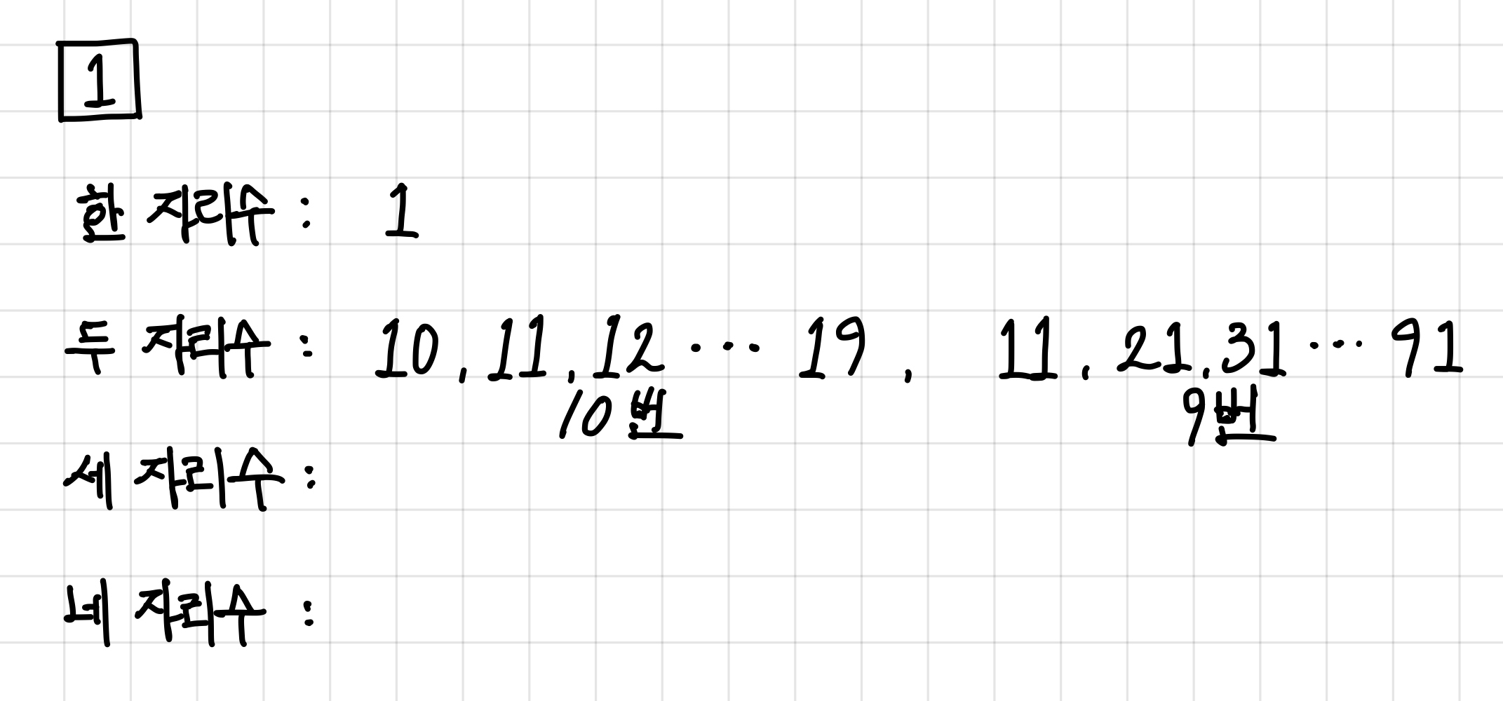 일단 한 자리수 일때 1은 당연히 한 번만 등장한다.▼