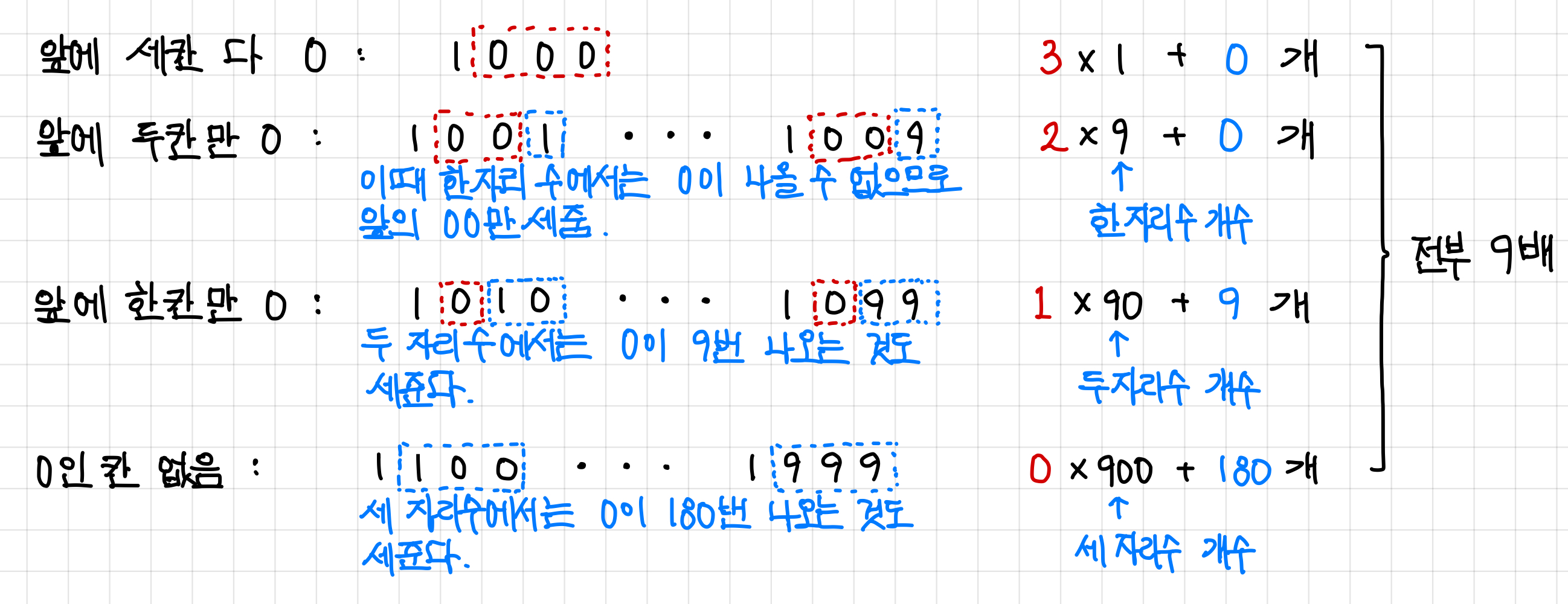 이 숫자는 5자리이므로, 앞서 구해준 4자릿수의 0부터 9의 등장 횟수 누적합을 답에 더해준다.