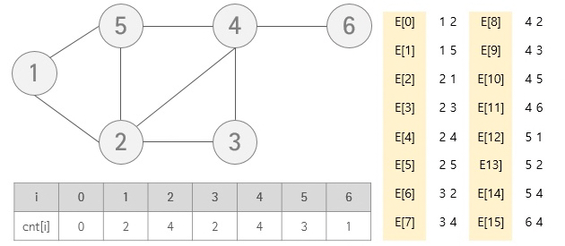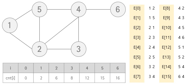 i번 정점과 연결된 간선은 E배열에서 cnt[i - 1] ~ cnt[i] - 1 까지이다.