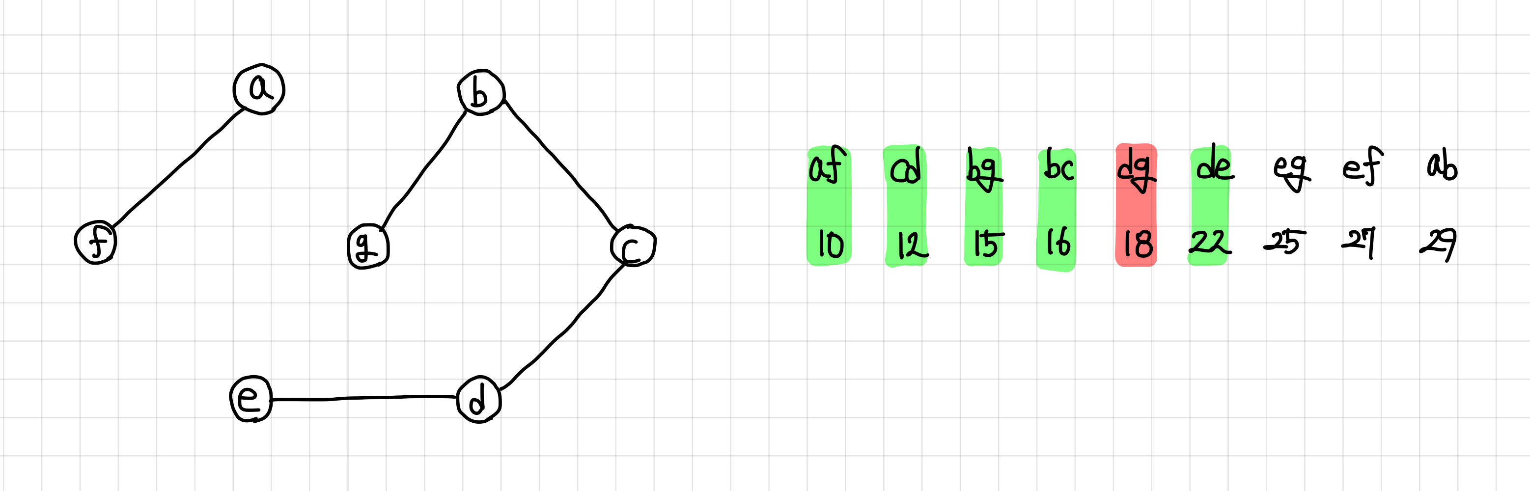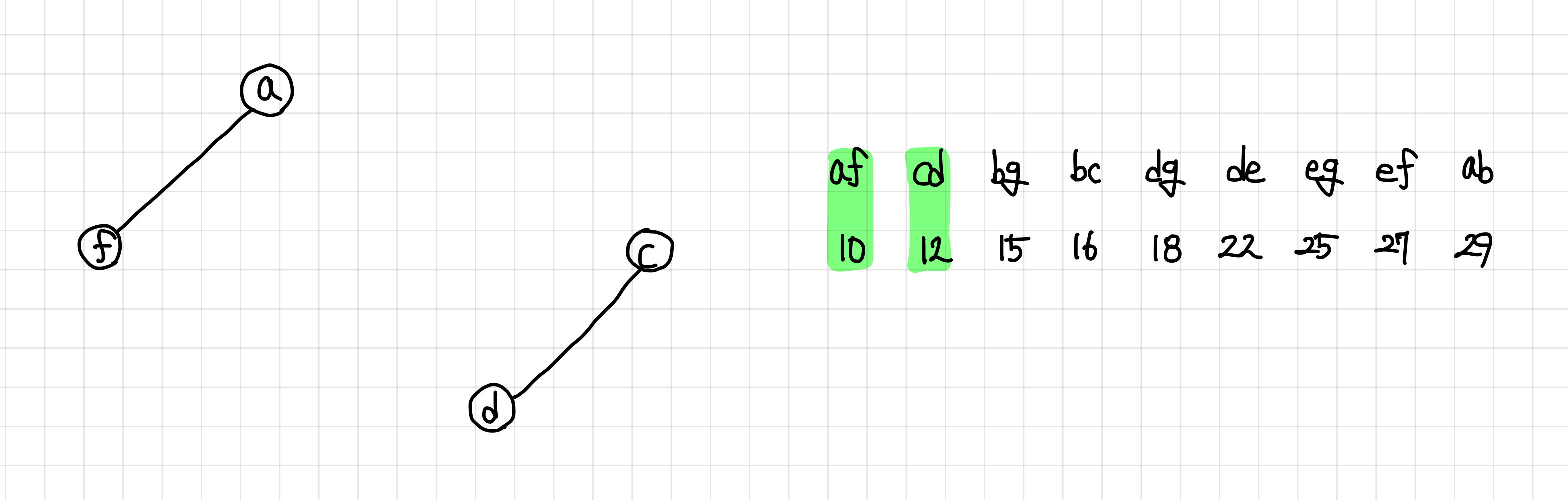9. 다음 간선은 연결이 되고, 싸이클도 형성하지 않으므로 MST 집합에 추가한다.