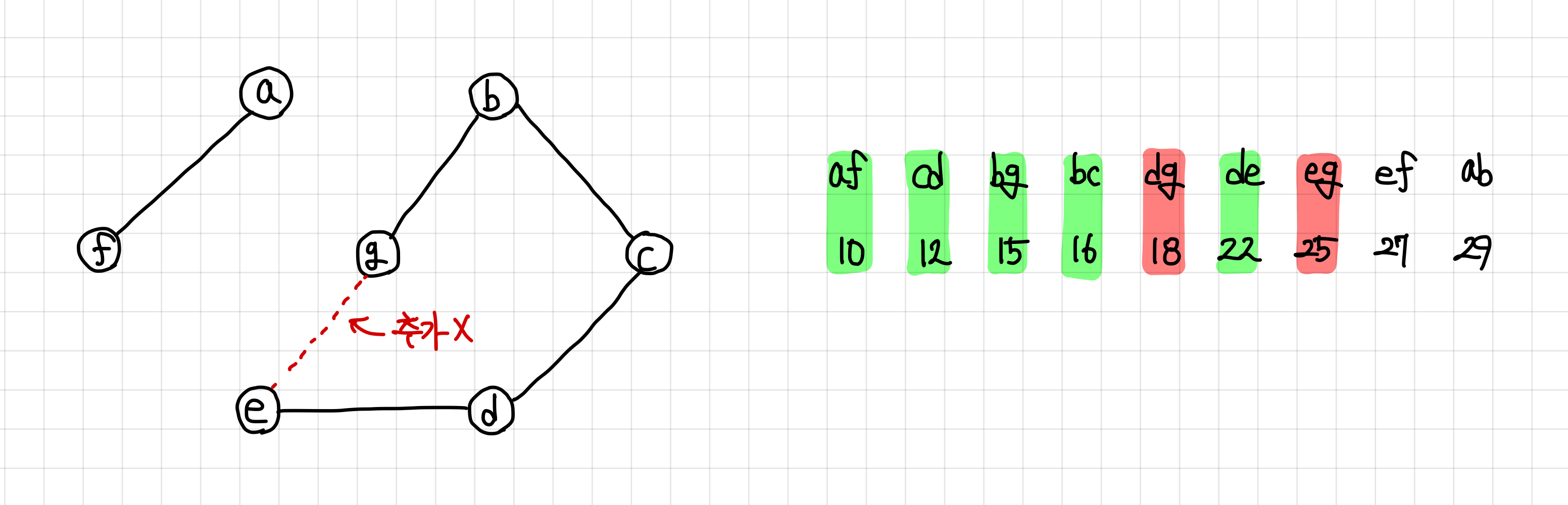 당연하게도, 마지막 간선은 연결하게 되면 싸이클을 형성하므로 추가하지 않는다.