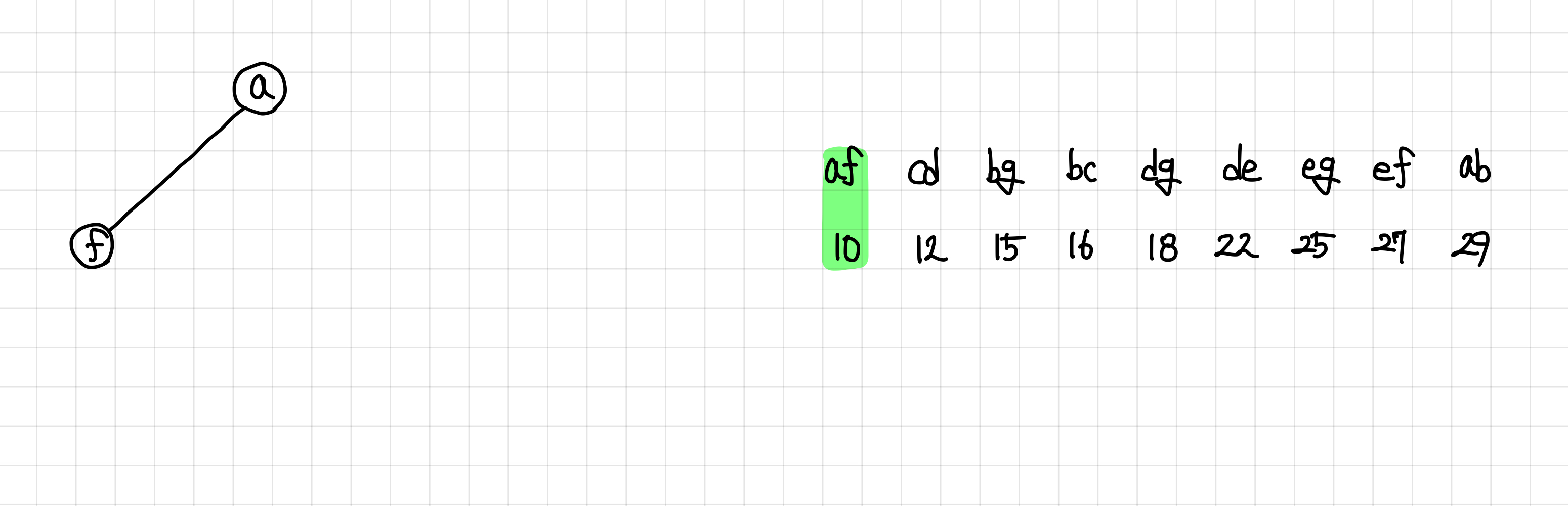 5. 앞에서와 똑같이 큐에 값을 넣어주고, 가장 작은 가중치의 간선으로 이동한다. 현재는 큐에 25, 29, 18, 12가 들어있게 되고 이 중 가장 작은 가중치 12짜리 간선으로 이동한다.