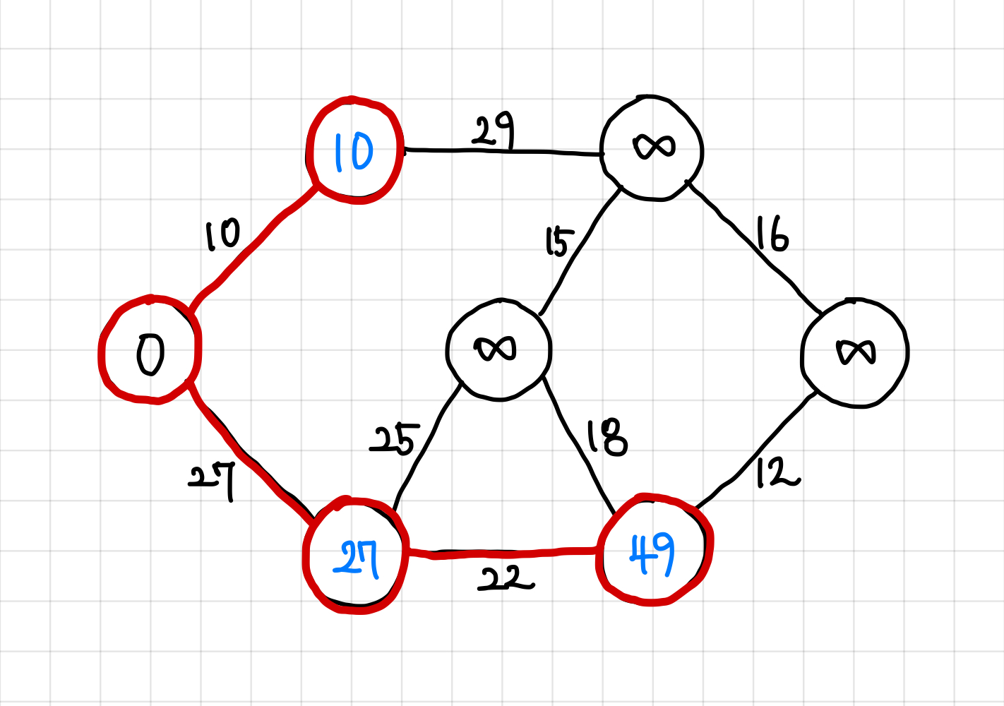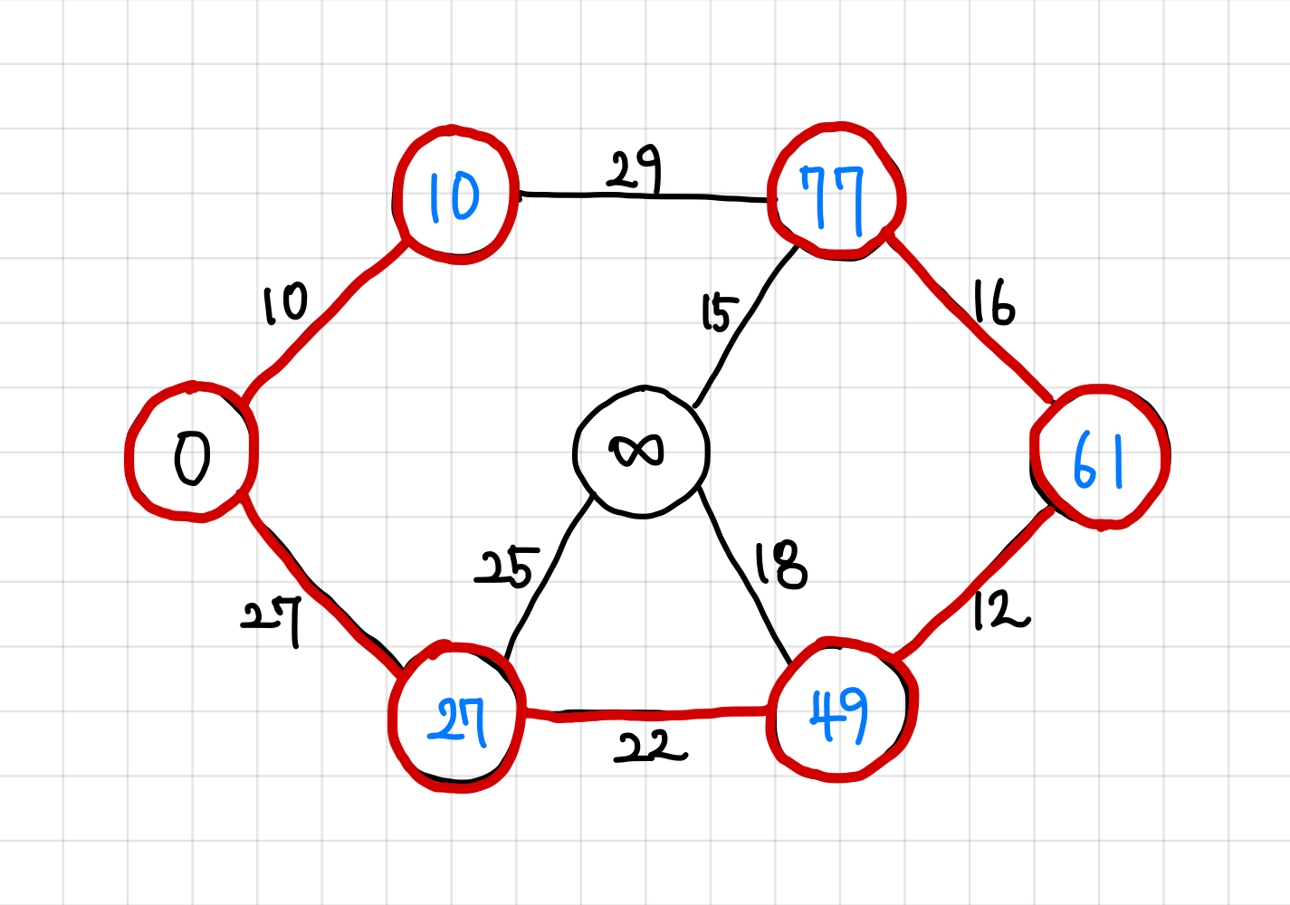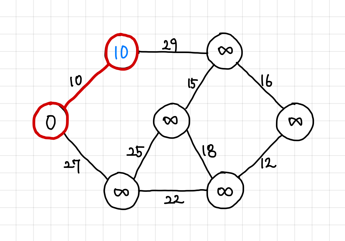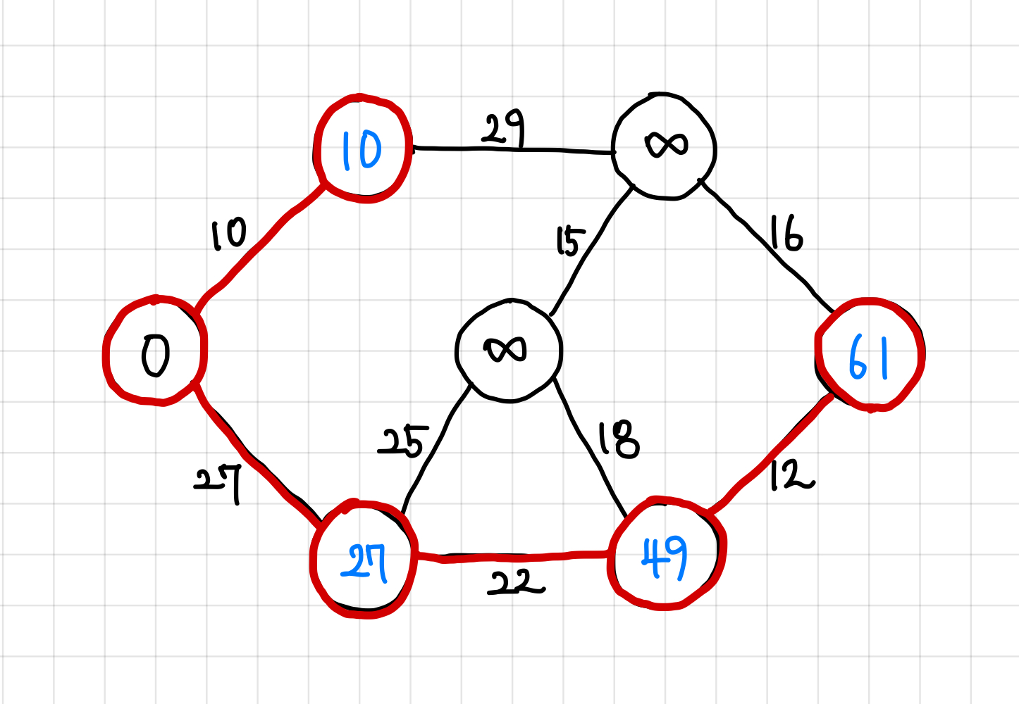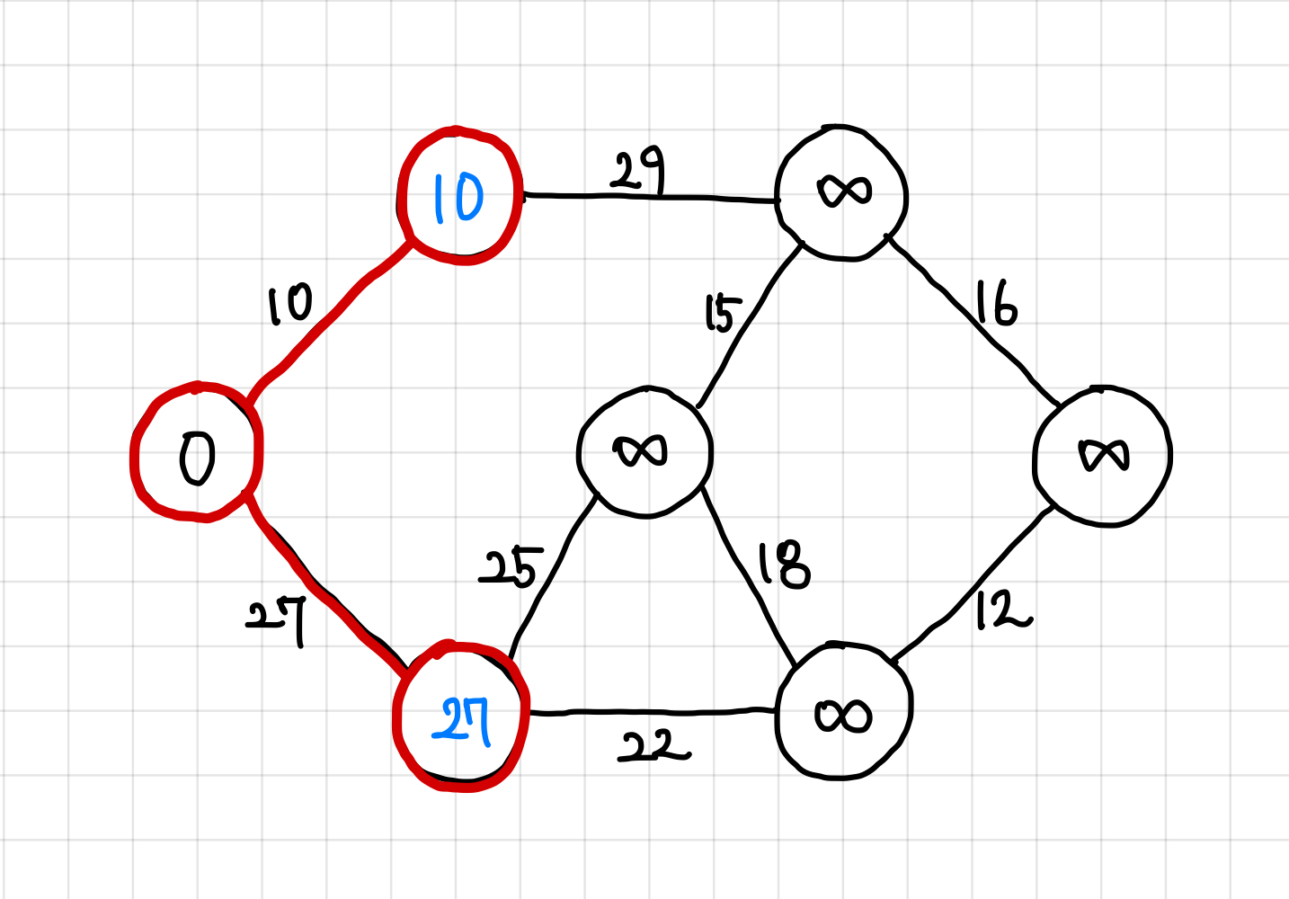 현재는 29보다는 27이 더 작으므로, 다음에는 가중치 27짜리 간선을 타고 이동한다.