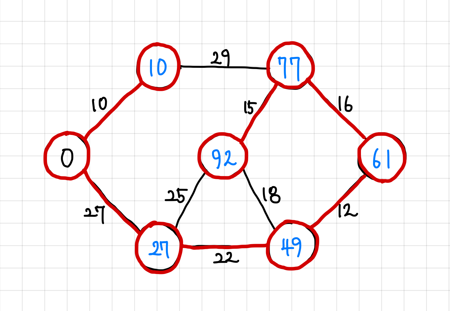 5. 앞에서와 똑같이 큐에 값을 넣어주고, 가장 작은 가중치의 간선으로 이동한다. 현재는 큐에 25, 29, 18, 12가 들어있게 되고 이 중 가장 작은 가중치 12짜리 간선으로 이동한다.