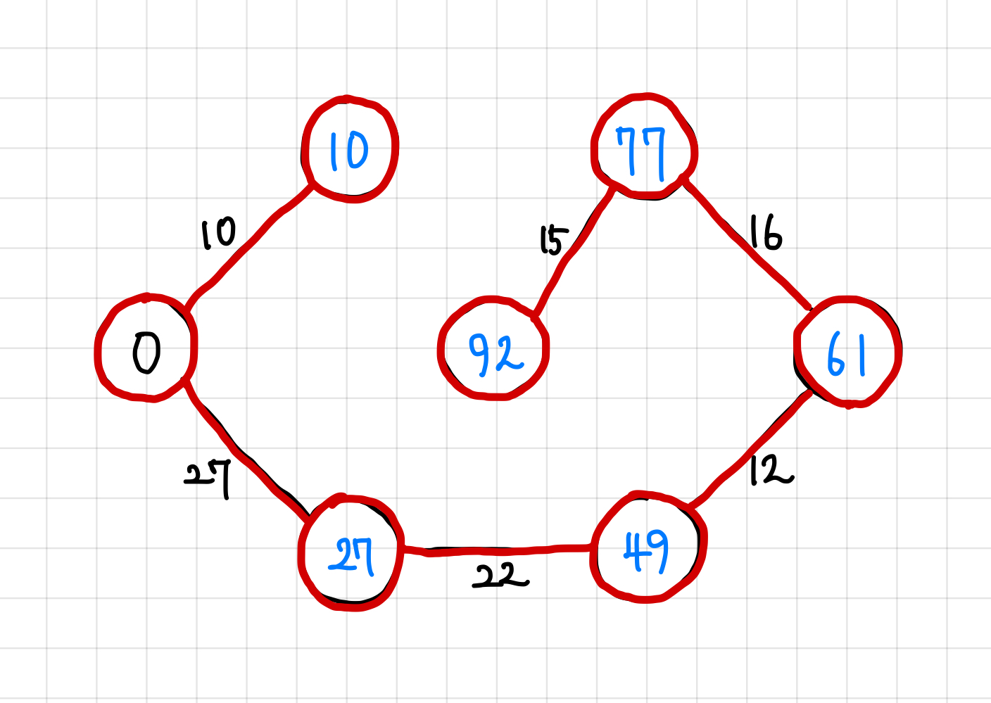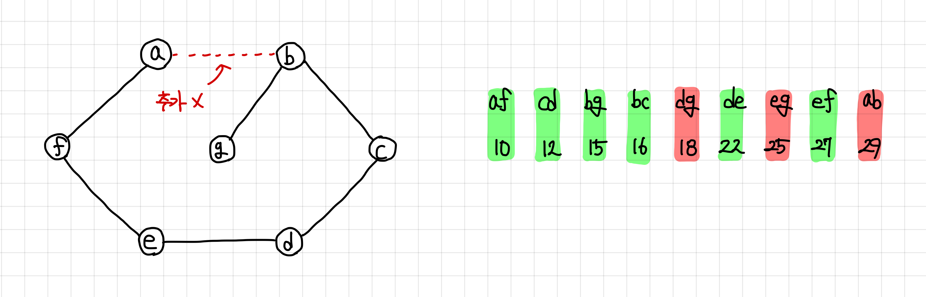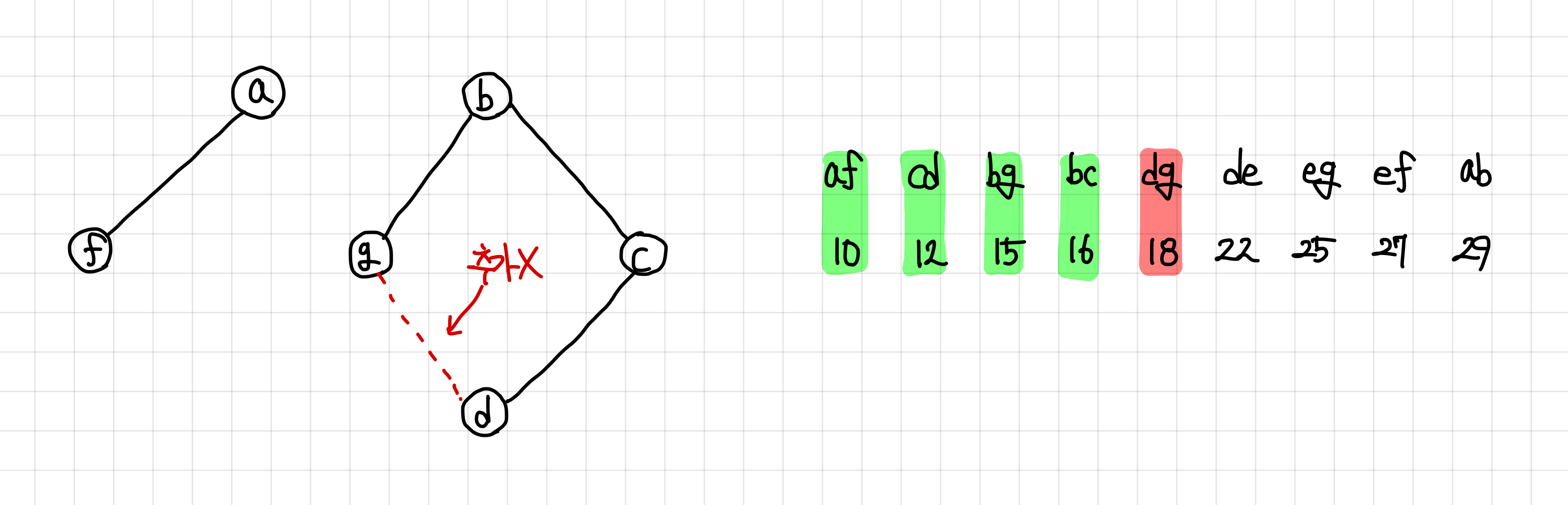 당연하게도, 마지막 간선은 연결하게 되면 싸이클을 형성하므로 추가하지 않는다.