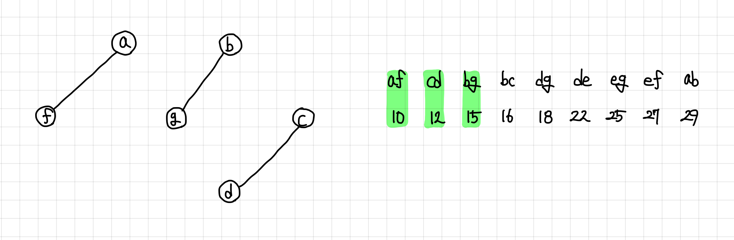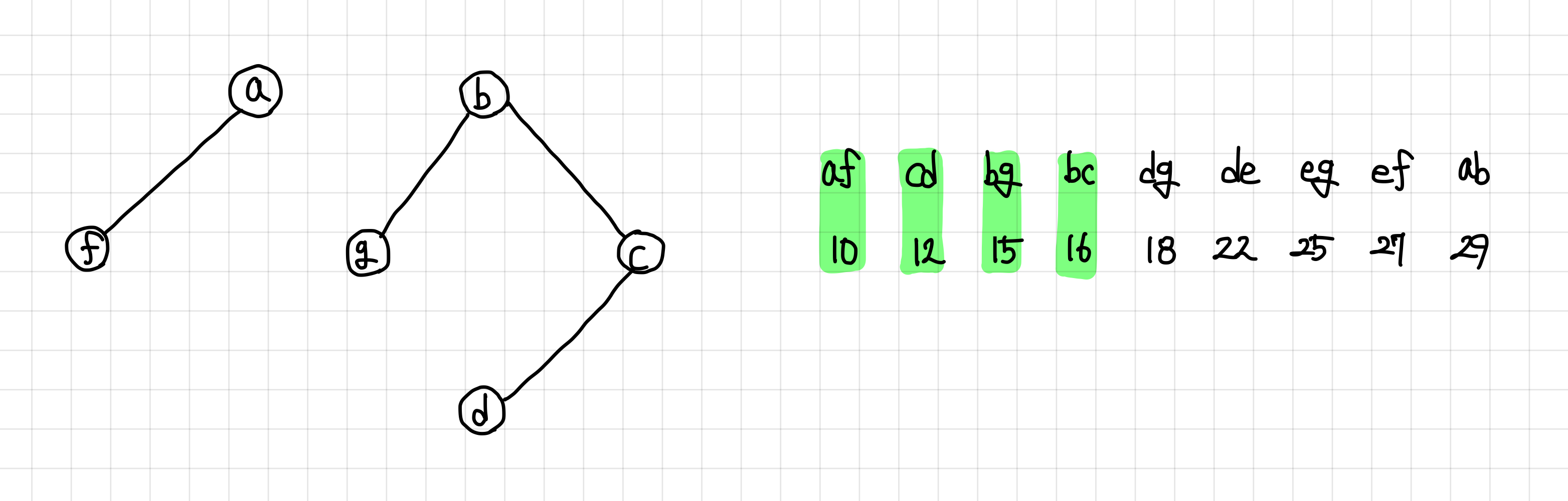 9. 다음 간선은 연결이 되고, 싸이클도 형성하지 않으므로 MST 집합에 추가한다.