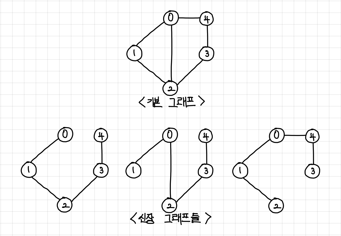 한 그래프에는 아래 그림처럼 여러 개의 신장 트리가 있을 수 있다.