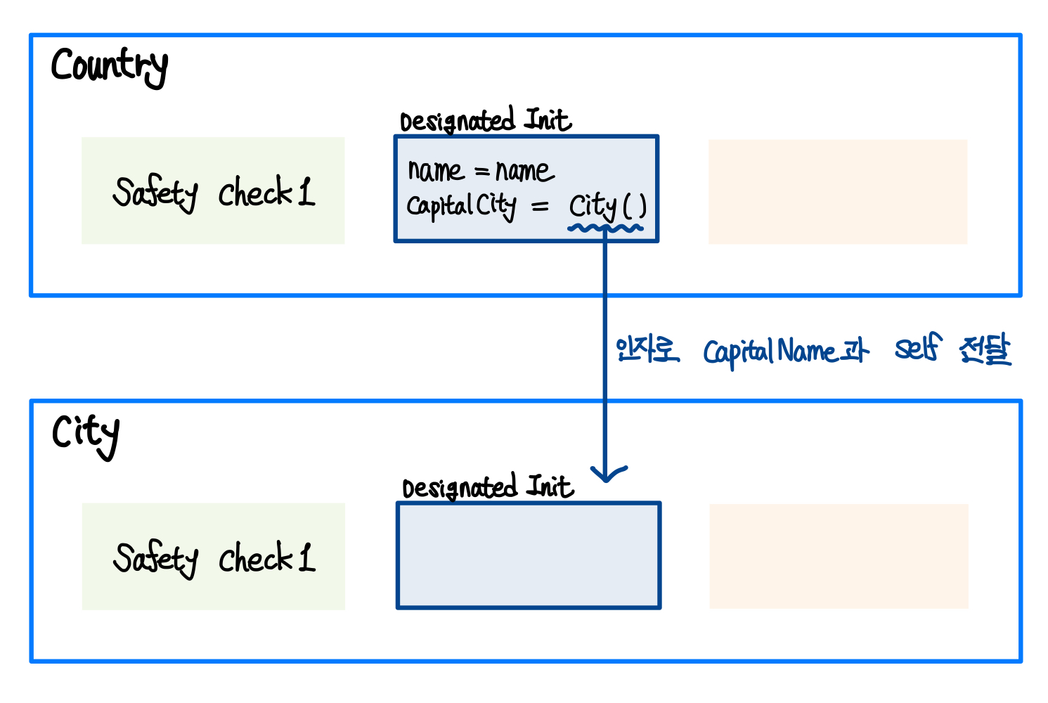 Country의 고유 속성인 name과 capitalCity에 대해서 초기화가 진행이 되는데, capitalCity에 값을 넣기 위해 City의 initializer가 호출된다. ▼