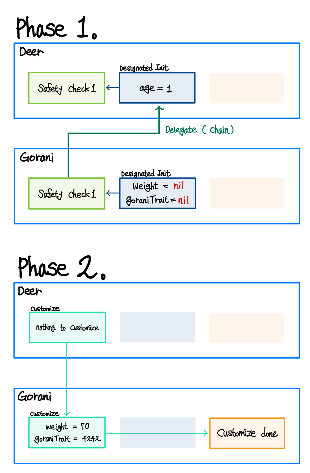 이렇게 되면, phase1에서 age, weight, goraniTrait 그 어느 것에 대해서도 초기화하지 않고 nil로 설정 한 후, phase2에서 상위 클래스인 Deer부터 값을 다시 초기화할 수 있게 된다. ▼