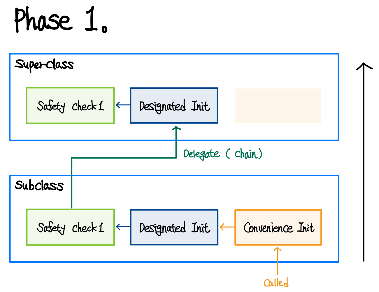 Designated initializer는 상위 클래스 이니셜라이저로 위임하기 전에 해당 클래스에 도입된 모든 속성들이 초기화되도록 보장해야 한다.