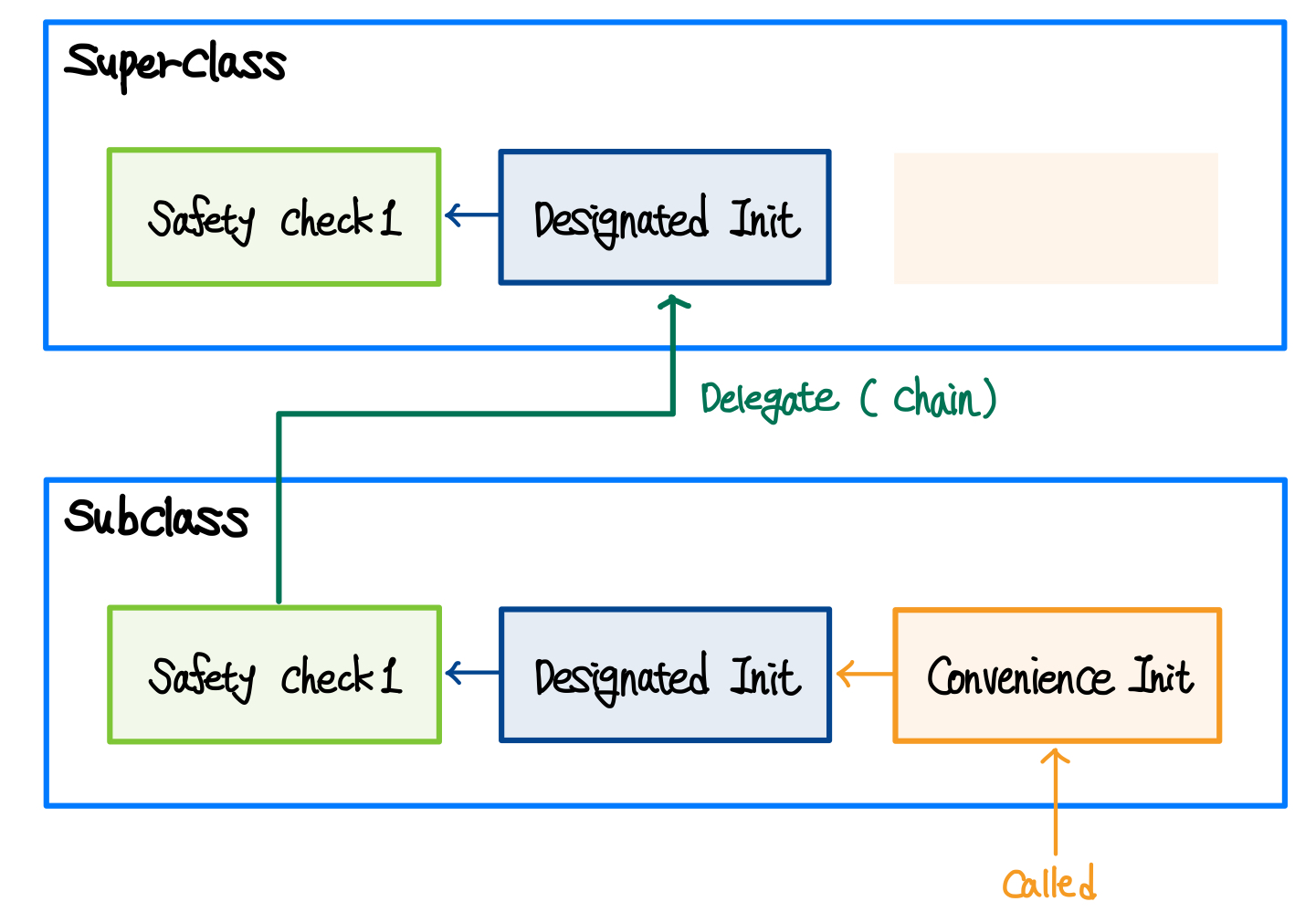 이로 인해 stored property의 메모리가 초기화된다. - Designated initializer는 상위 클래스 initializer에게 자신의 stored property에 대해 동일한 작업을 수행하도록 위임한다.