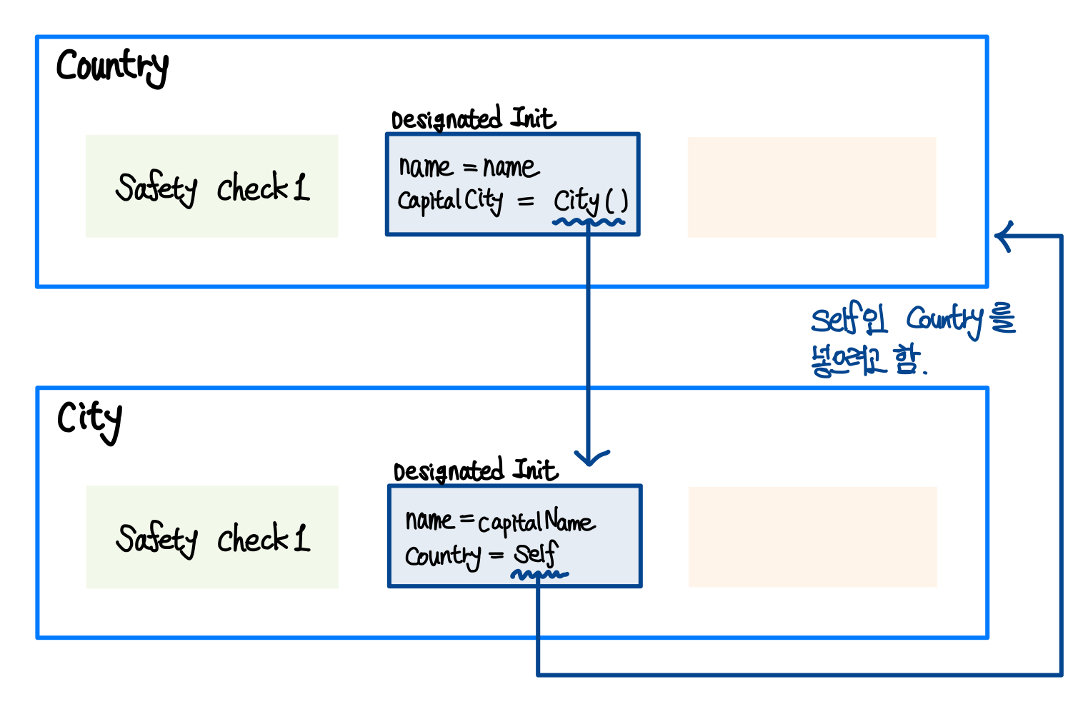 Country의 고유 속성인 name과 capitalCity에 대해서 초기화가 진행이 되는데, capitalCity에 값을 넣기 위해 City의 initializer가 호출된다. ▼