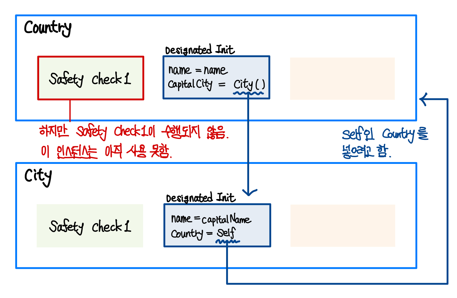 그리고 이 안정성을 지키기 위해 Swift의 컴파일러는 4가지 safety-check를 통해 Two phase initialization가 오류 없이 마무리 되게 도운다.