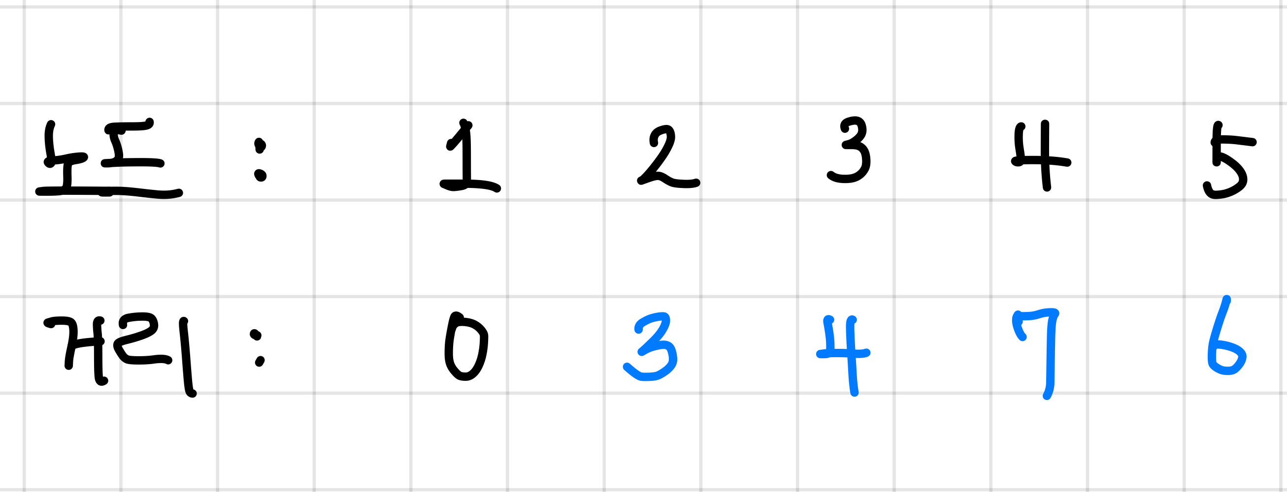 그리고 이 값들은 현재 INF보다 당연히 작으므로 거리 값을 3, 6, 7로 바꿔준다.