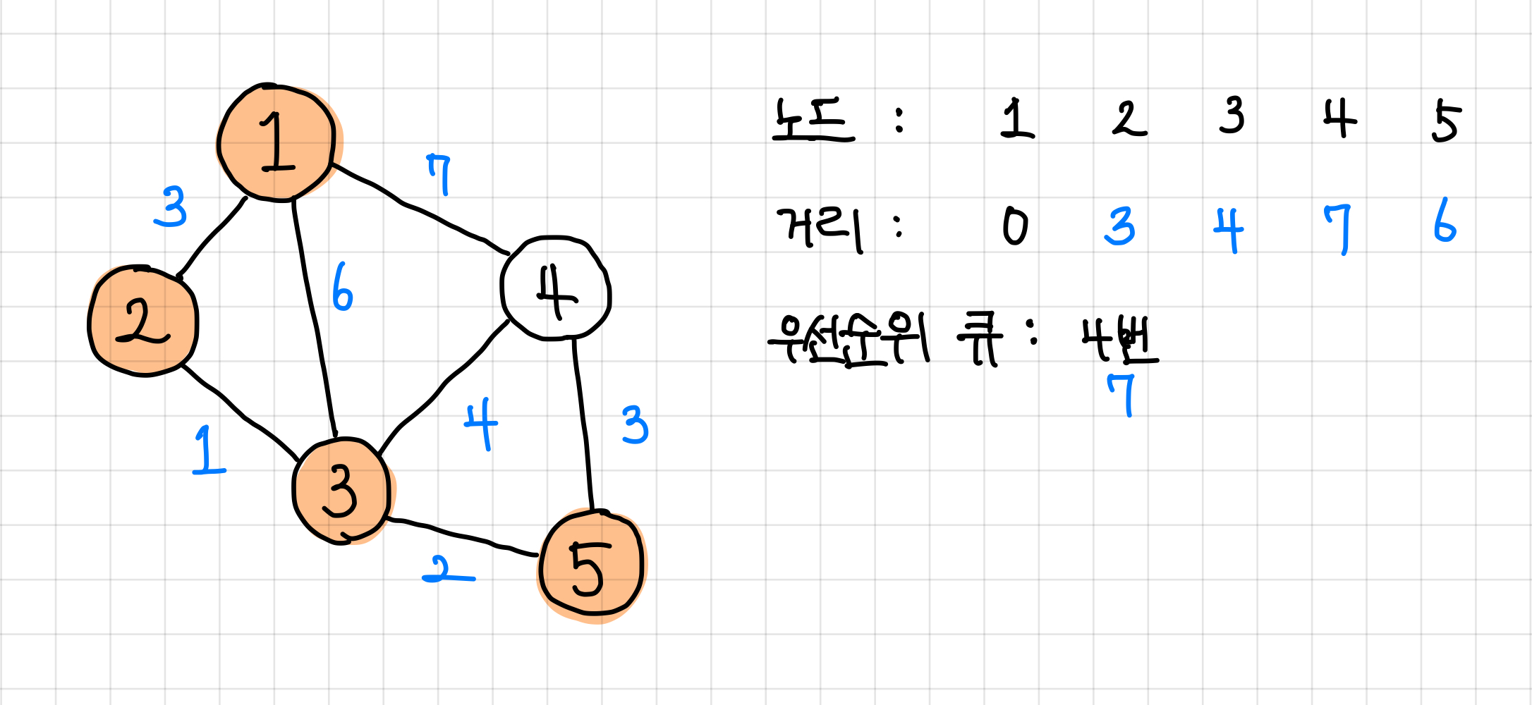 1. 일단은 1번 노드에 붙어 있는 노드인 2번, 3번, 4번 노드 까지의 최단 거리는 각각 3, 6, 7로 둘 수 있다.