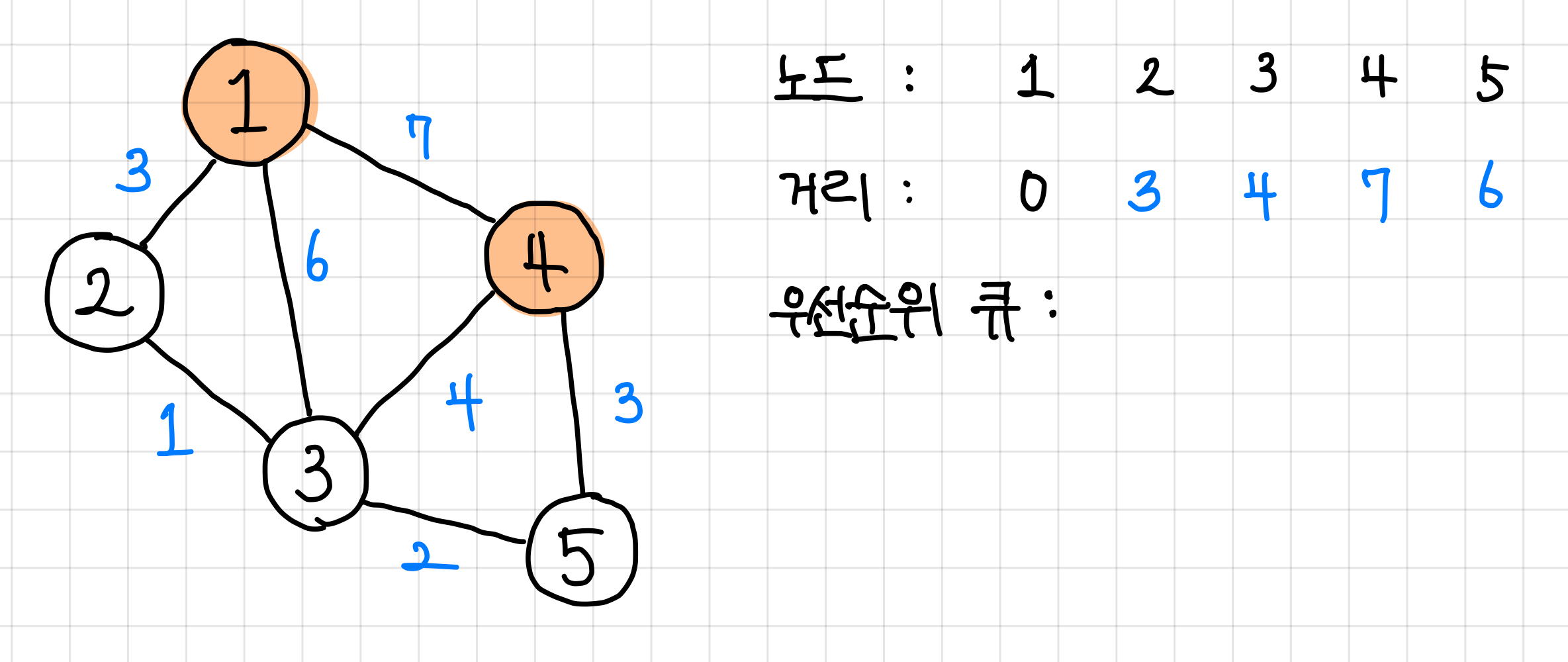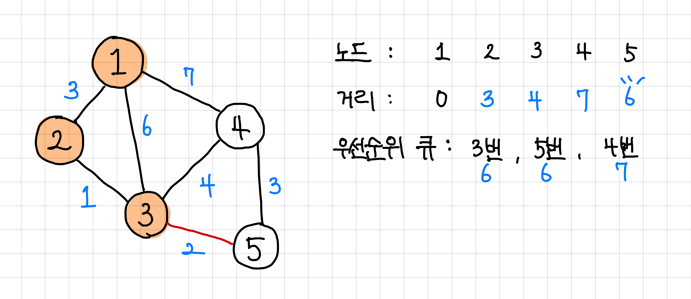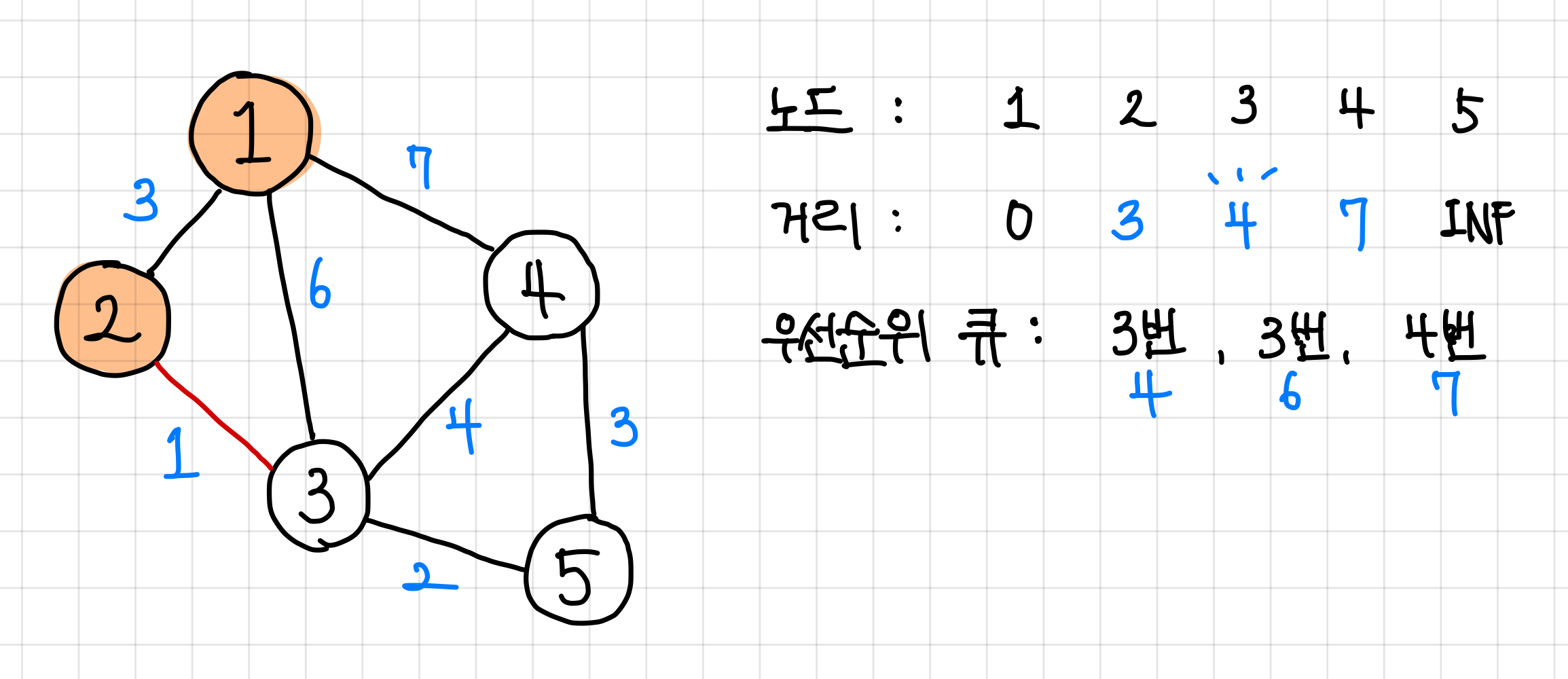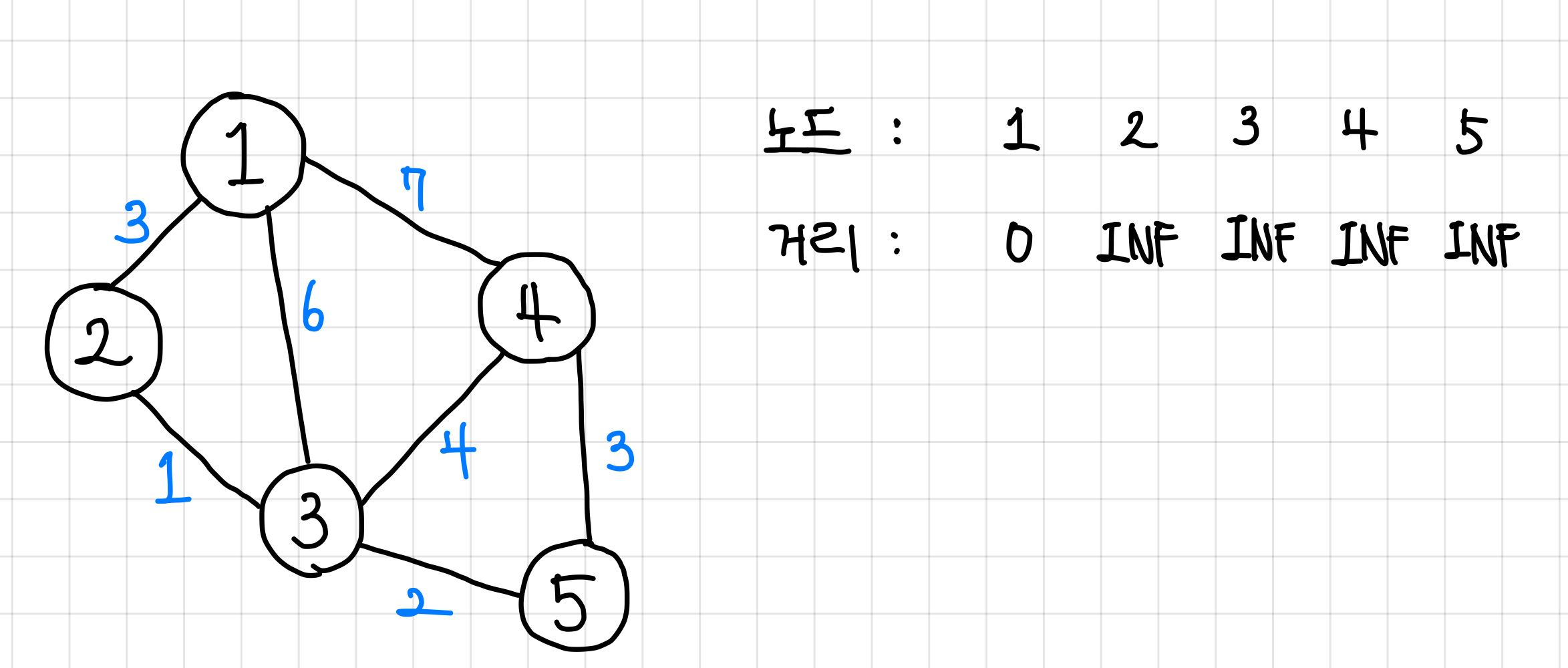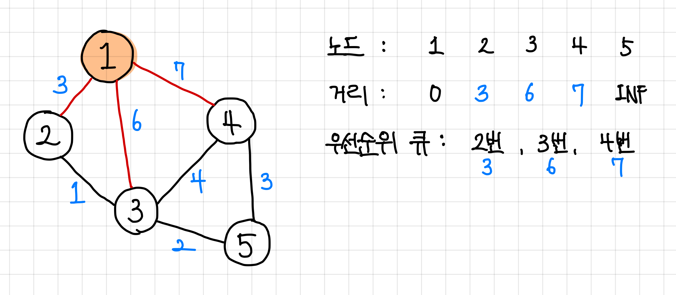 1. 일단은 1번 노드에 붙어 있는 노드인 2번, 3번, 4번 노드 까지의 최단 거리는 각각 3, 6, 7로 둘 수 있다.