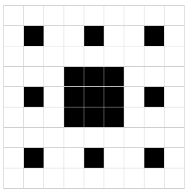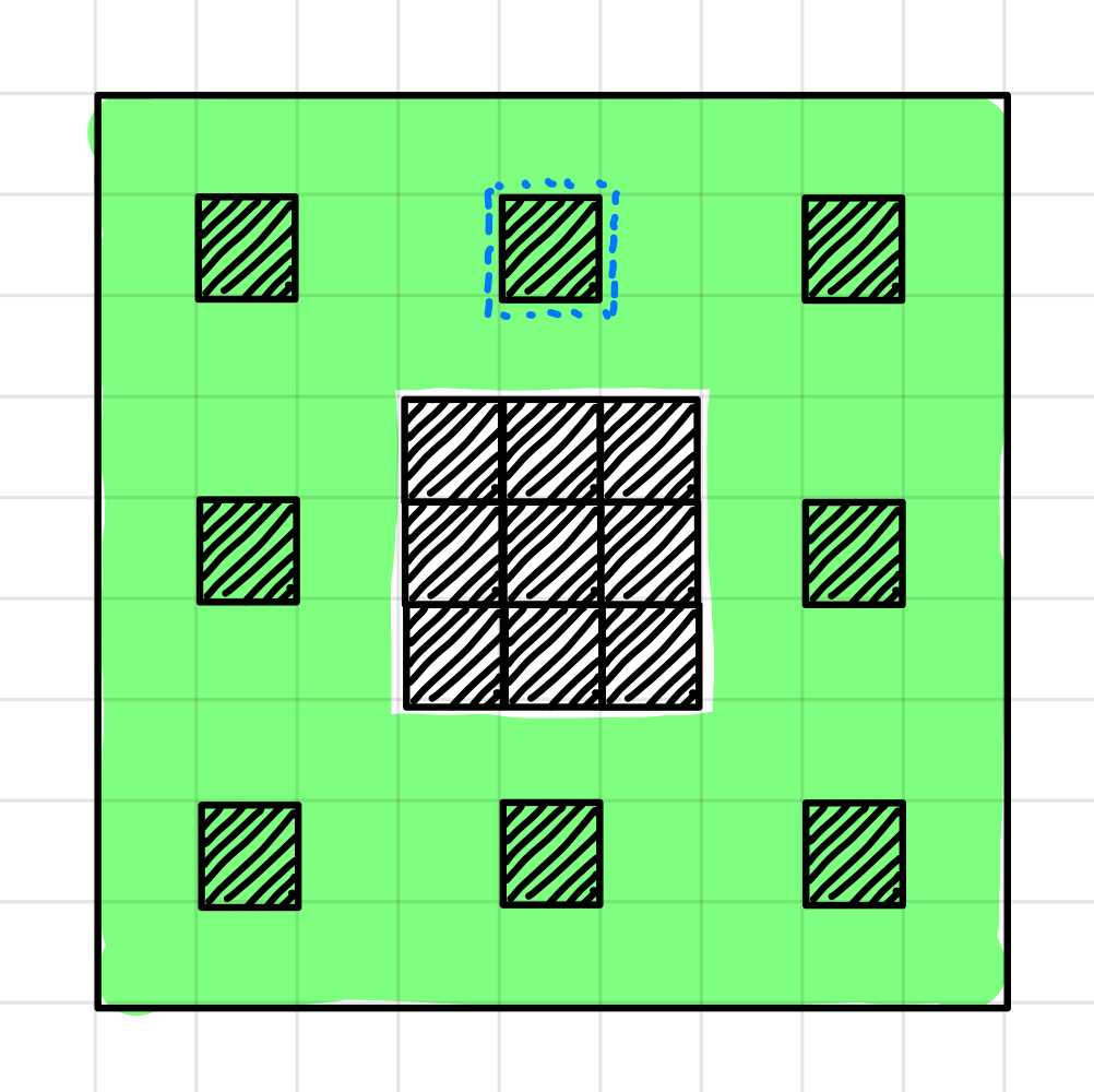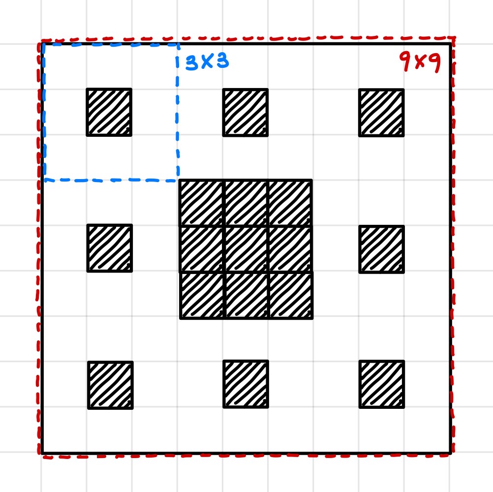 위의 그림처럼 9 * 9 크기 프랙탈은 3 * 3 크기 프랙탈 8개와 가운데 검정 블럭이 모여서 만들어진다.