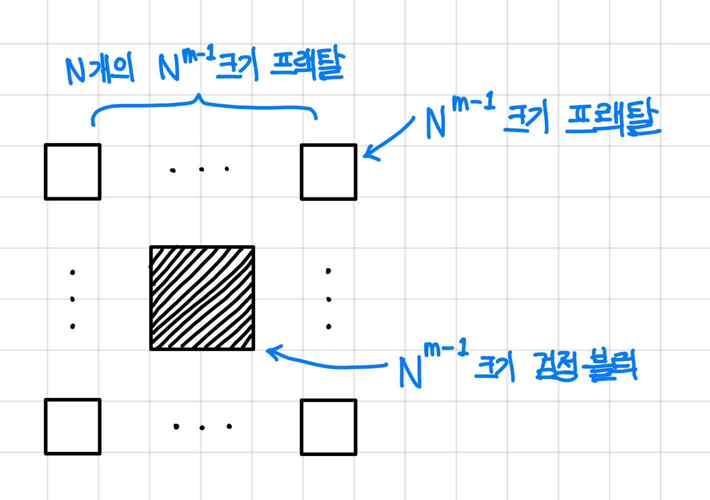 다들 잘 알겠지만, 위의 프랙탈 구조는 만약에 한 변의 크기가 $n^m$이라면, 이는 한 변의 크기가 $n^{m-1}$인 프랙탈 구조가 모여서 생성이 된다.