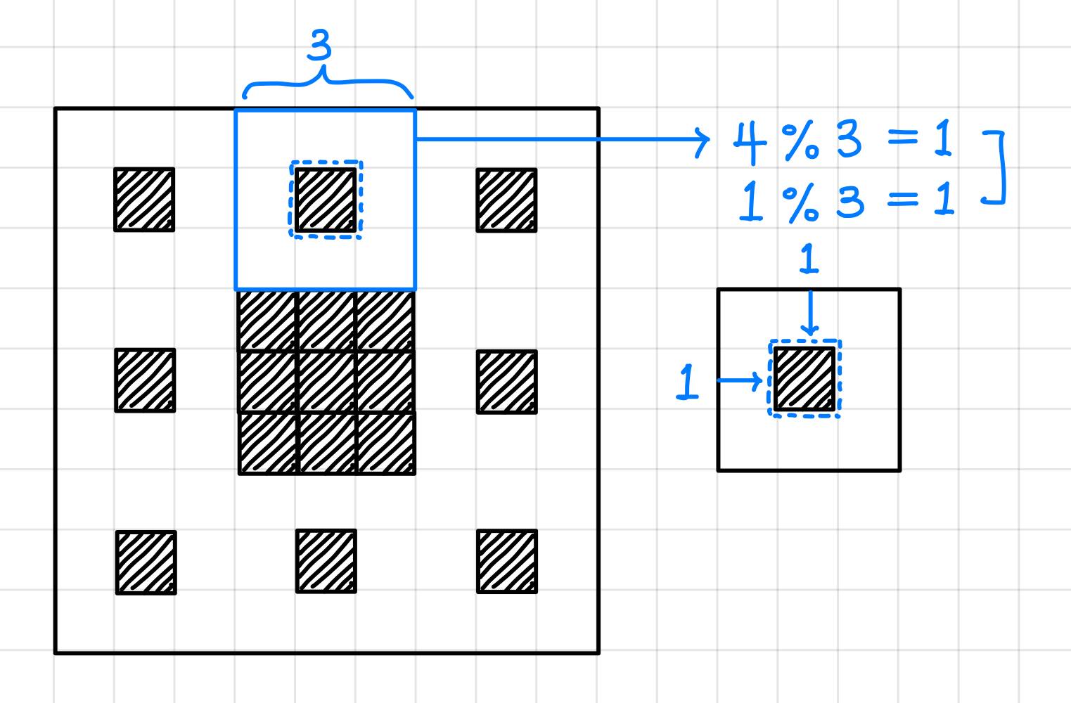 그러면 우리가 찾고자 했던 좌표인 (4, 1)는 이 좌표가 해당한 프랙탈 크기로 나누어 나머지를 구하면 상대 좌표가 나온다.▼