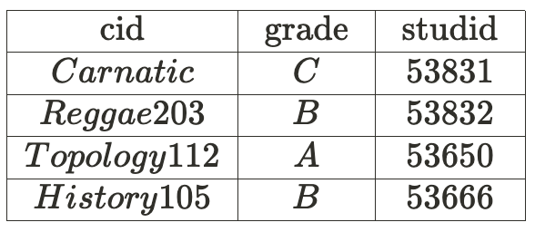 Enrolled (studid: String, cid: String, grade: String)