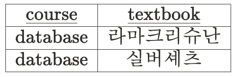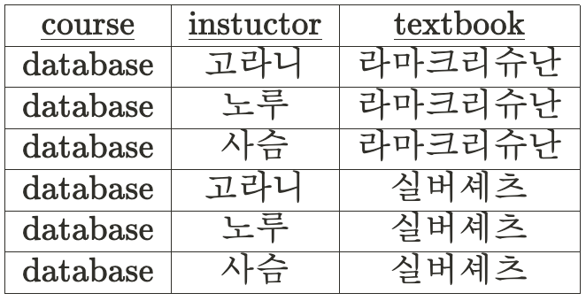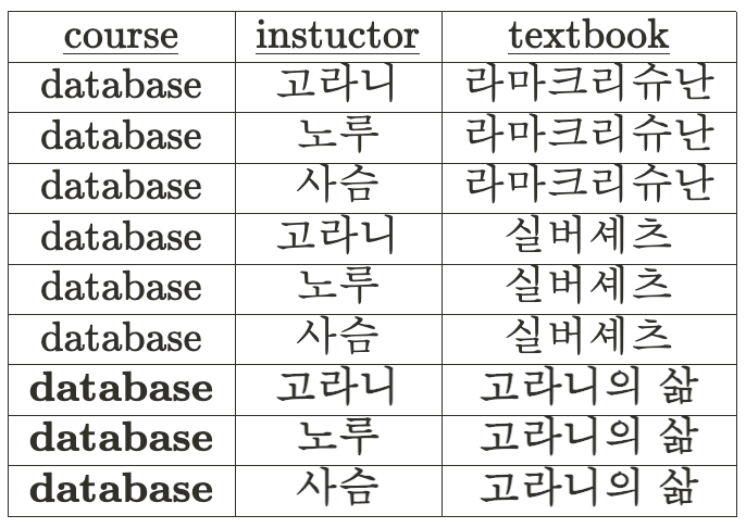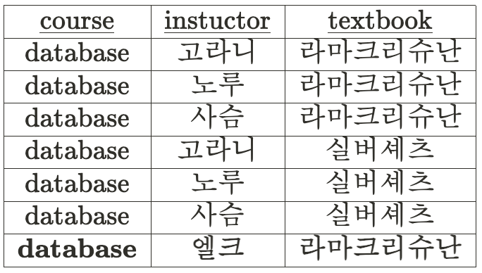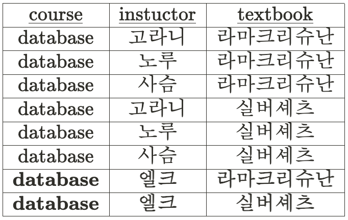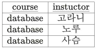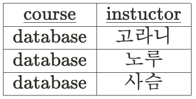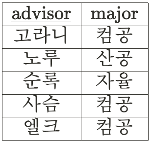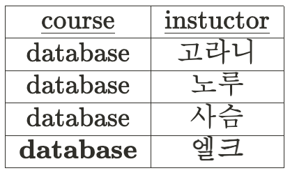아래의 테이블의 경우, database라는 값은 고라니, 노루, 사슴이라는 instructor 값을 결정하게 된다.▼
