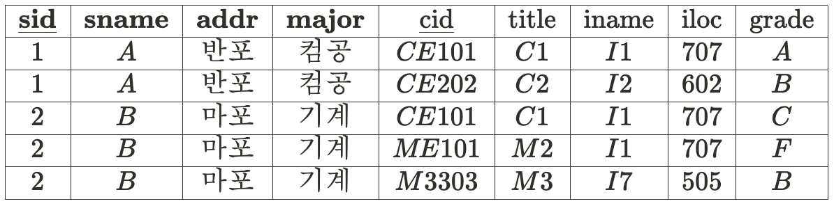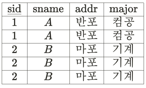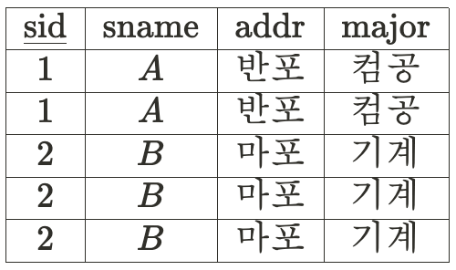 아래의 테이블을 보면 sid가 sname과 addr, major를 결정한다.▼