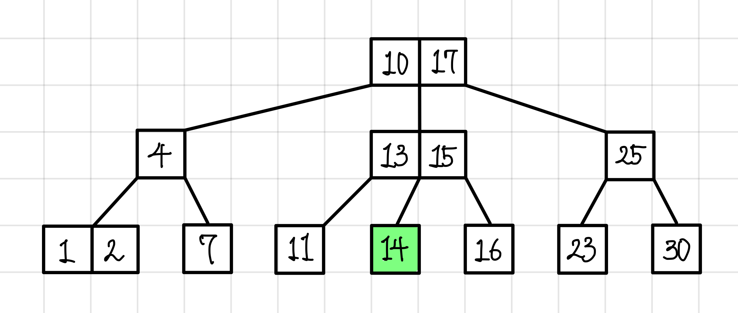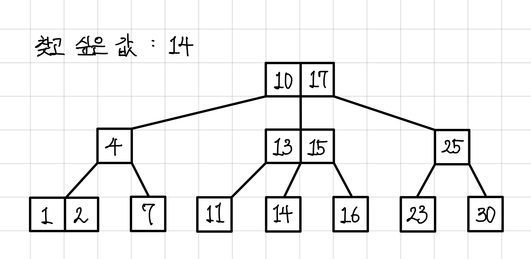 가운데 경로로 내려가서 값을 탐색했을 때 14가 있으므로 조회에 성공한다.▼