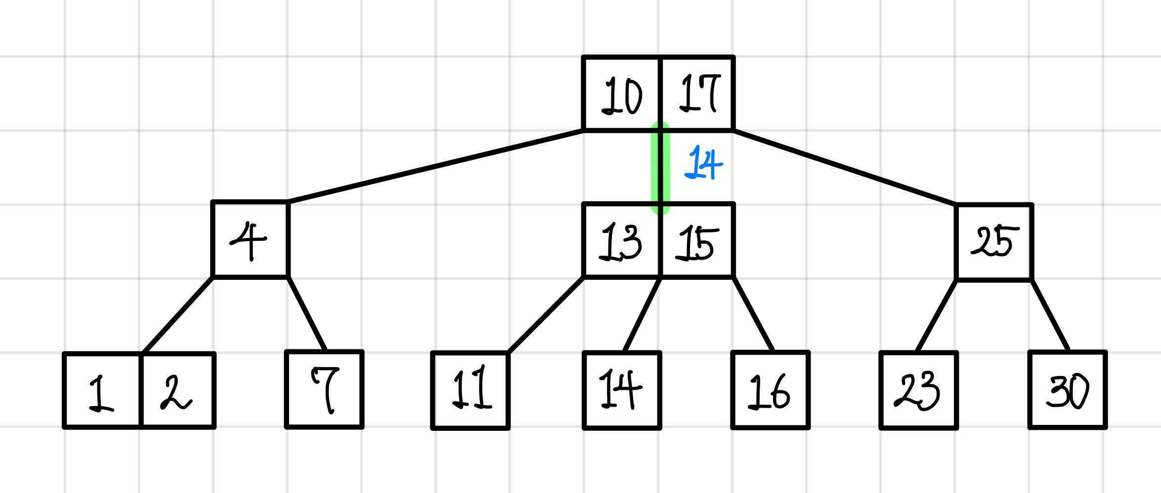 가운데 경로로 내려가서 값을 탐색했을 때 14가 있으므로 조회에 성공한다.▼