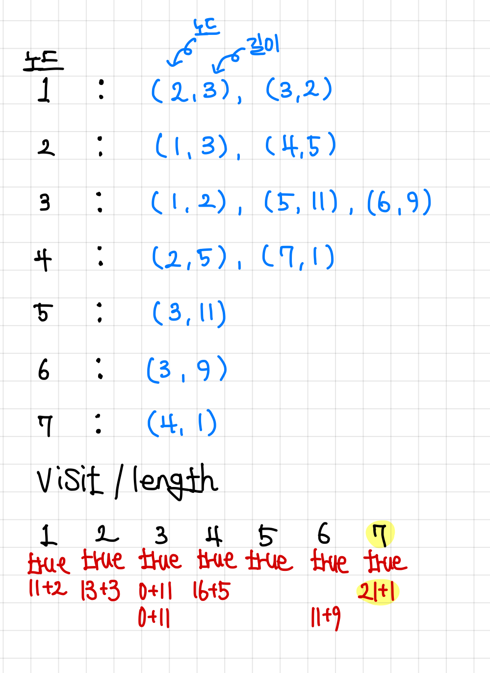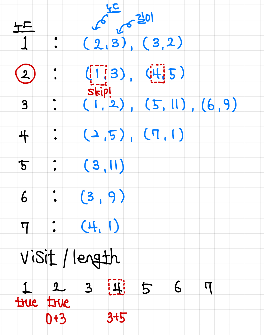 노드 2에는 방문한 적이 없으므로 노드 2를 다음 방문 노드로 정하고, length에 노드 1과 2 사이의 거리인 3을 더해준다.▼