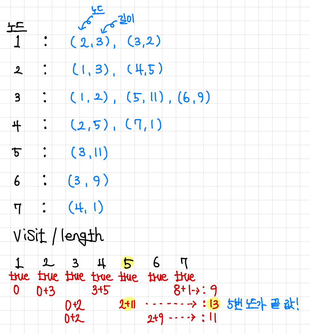 과정을 반복해주고 나면 이렇게 결과가 나오는데 가장 긴 값은 5번 노드쪽으로 갔을 때이다.