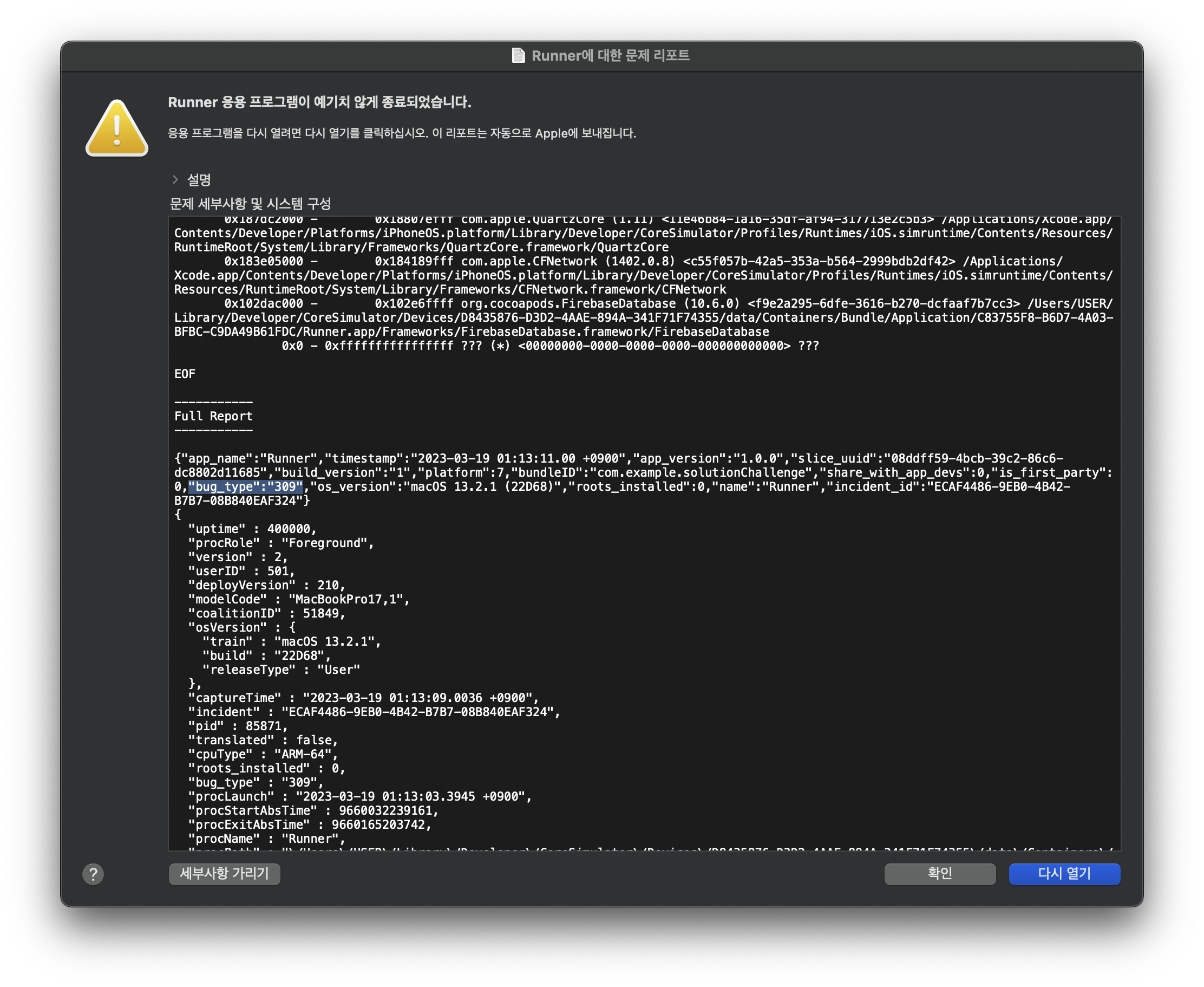 그래도 로그에서 뭔가를 알 수 있지 않을까 하고 읽어보다가 “bug_type” : ”309”이라는 것을 보고 바로 검색해보았다.▼