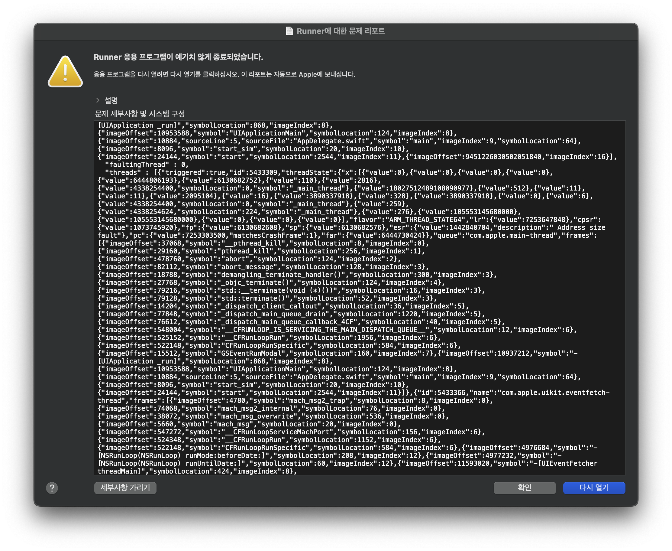 종료되고 나서 그나마 다행히 MacOS의 버그 리포트가 나와서 로그를 보려고 했는데, 상당히 길었다…▼
