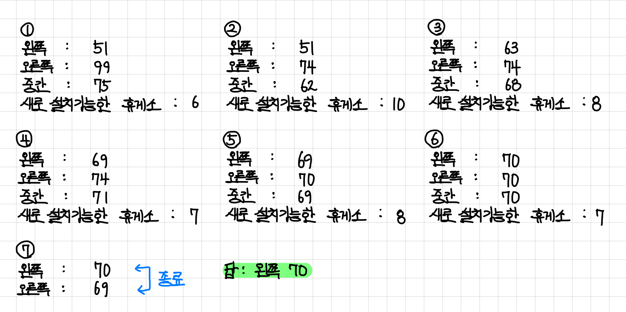 예제에서는 휴게소를 7개 설치하라고 했는데, 구한 휴게소 개수는 0개로 휴게소를 더 많이 설치해야한다.