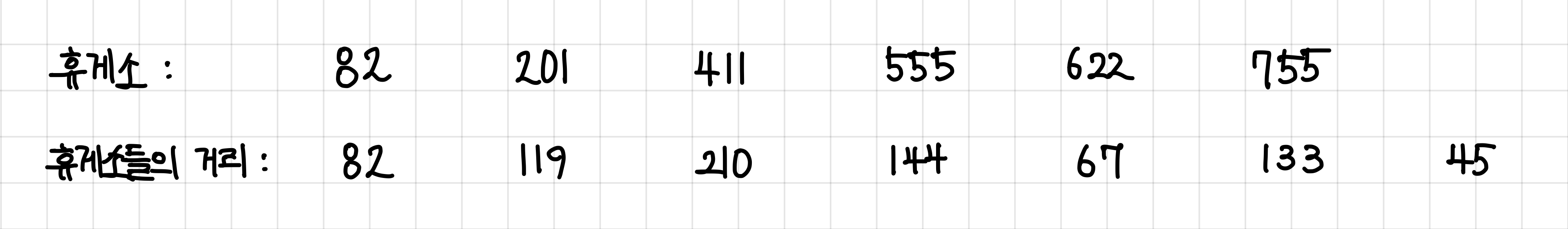 처음에는 휴게소들 간의 거리와 배열의 인덱스를 중점으로 접근했었는데, 접근 방식을 바꿨다.