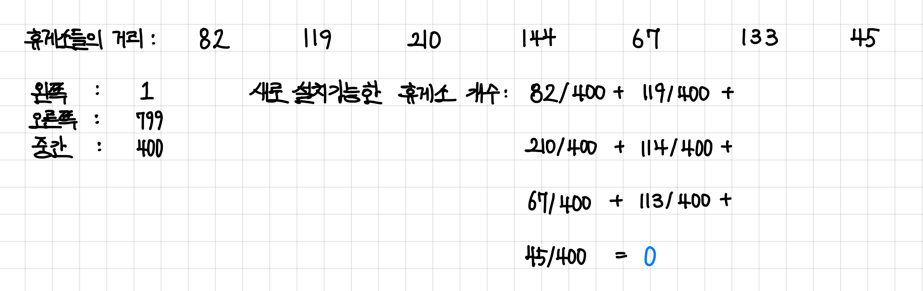 예제에서는 휴게소를 7개 설치하라고 했는데, 구한 휴게소 개수는 0개로 휴게소를 더 많이 설치해야한다.