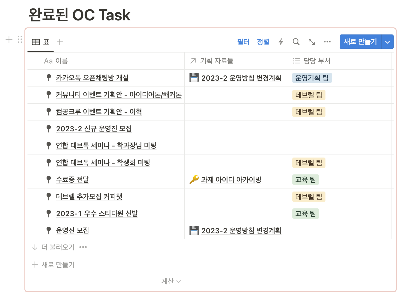 GDSC Hongik에서는 Task 데이터베이스를 동기화 블록에 넣어 매 회의 때마다 가장 최근에 완료된 Task를 볼 수 있게 했다. ▼
