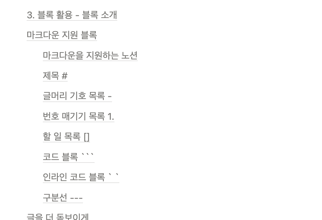 이렇게 위의 마크다운 문법들을 사용하여 빠르게 기본 블록과 코드 블록에 접근할 수 있다.