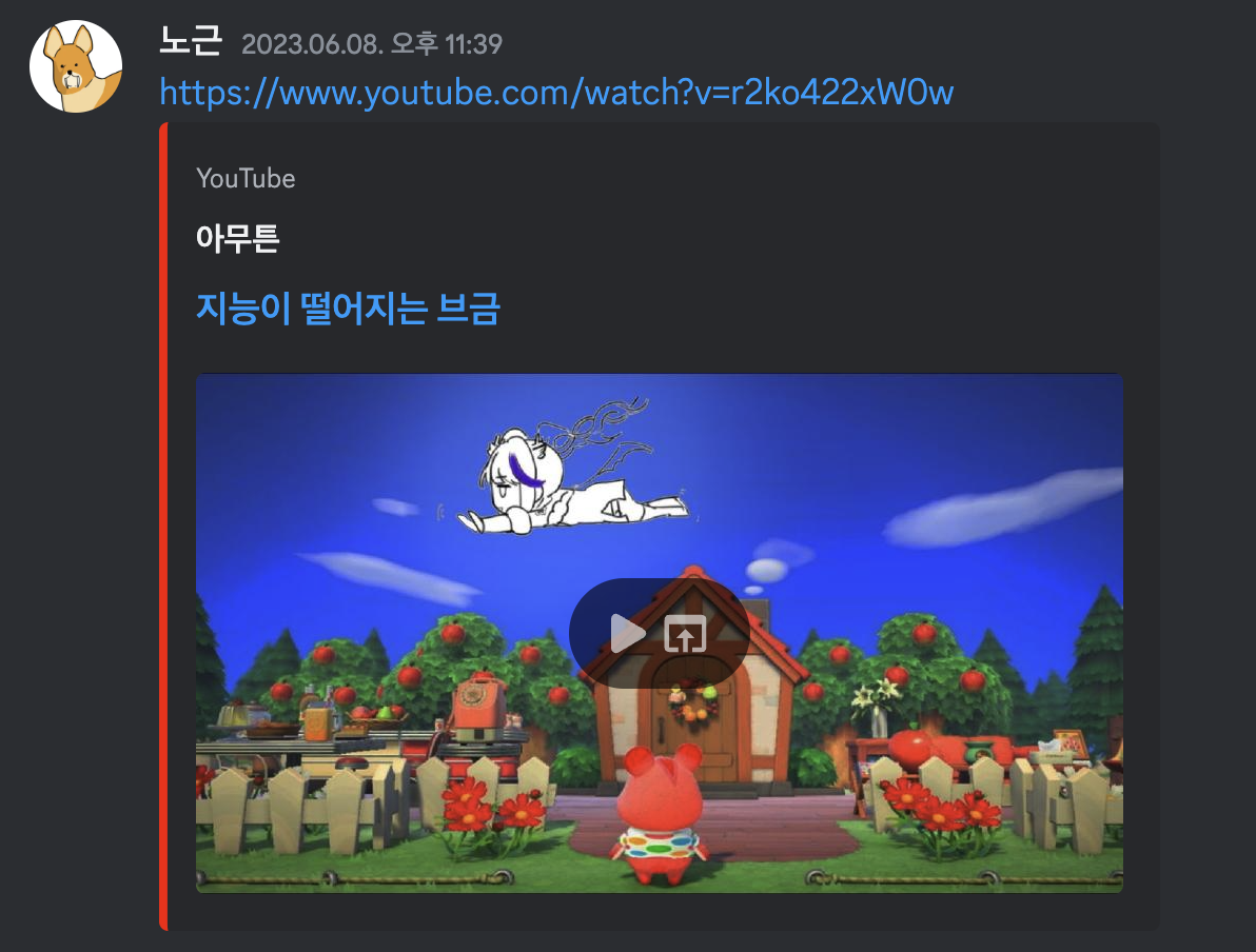 유튜브 링크를 보내면 자동으로 동영상 재생이 되게 준비되는 것과, 디스코드 메세지로 특정 사이트의 내용을 보내는 것 모두 임베드 기능이라고 할 수 있다. ▼