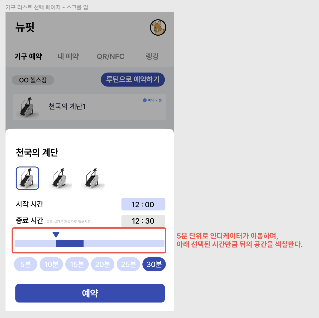 인디케이터가 5분 단위로 이동해야하며, 아래 선택된 시간만큼 인디케이터 뒷부분의 공간을 색칠해줘야한다.