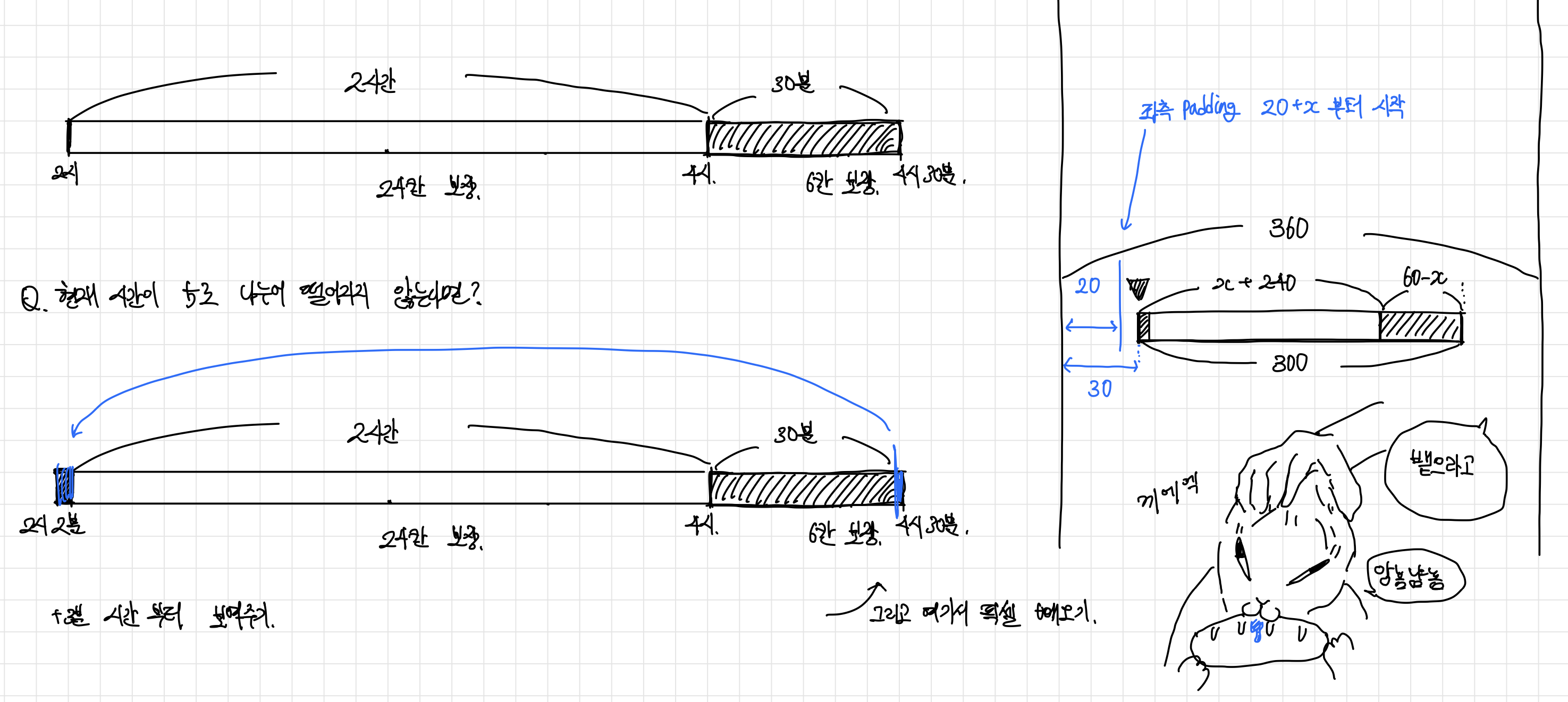 그리고 이를 5분 단위로 쪼개면, 총 30칸이 나오게 되어 좌우 Padding을 `30.w`씩 주고, 나머지 `300.w`을 30칸으로 나누어 한 칸에 `10.w`씩으로 정했다.