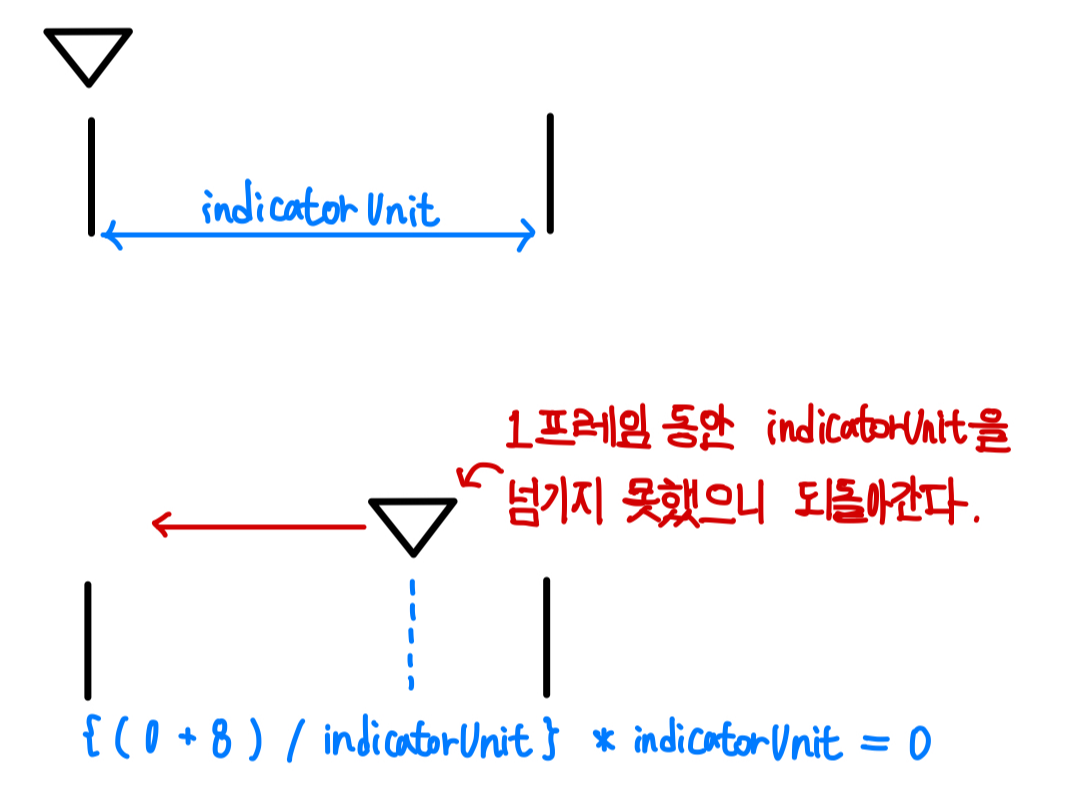 위의 코드는 현재 좌표에 이동량인 `delta`를 더해주고, 좌표가 특정 구간 내로 들어가면 `indicatorUnit`의 배수로 바꾸었다.