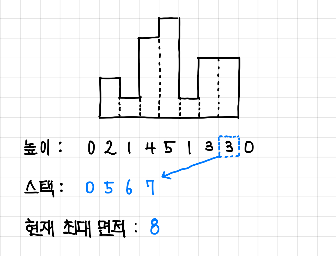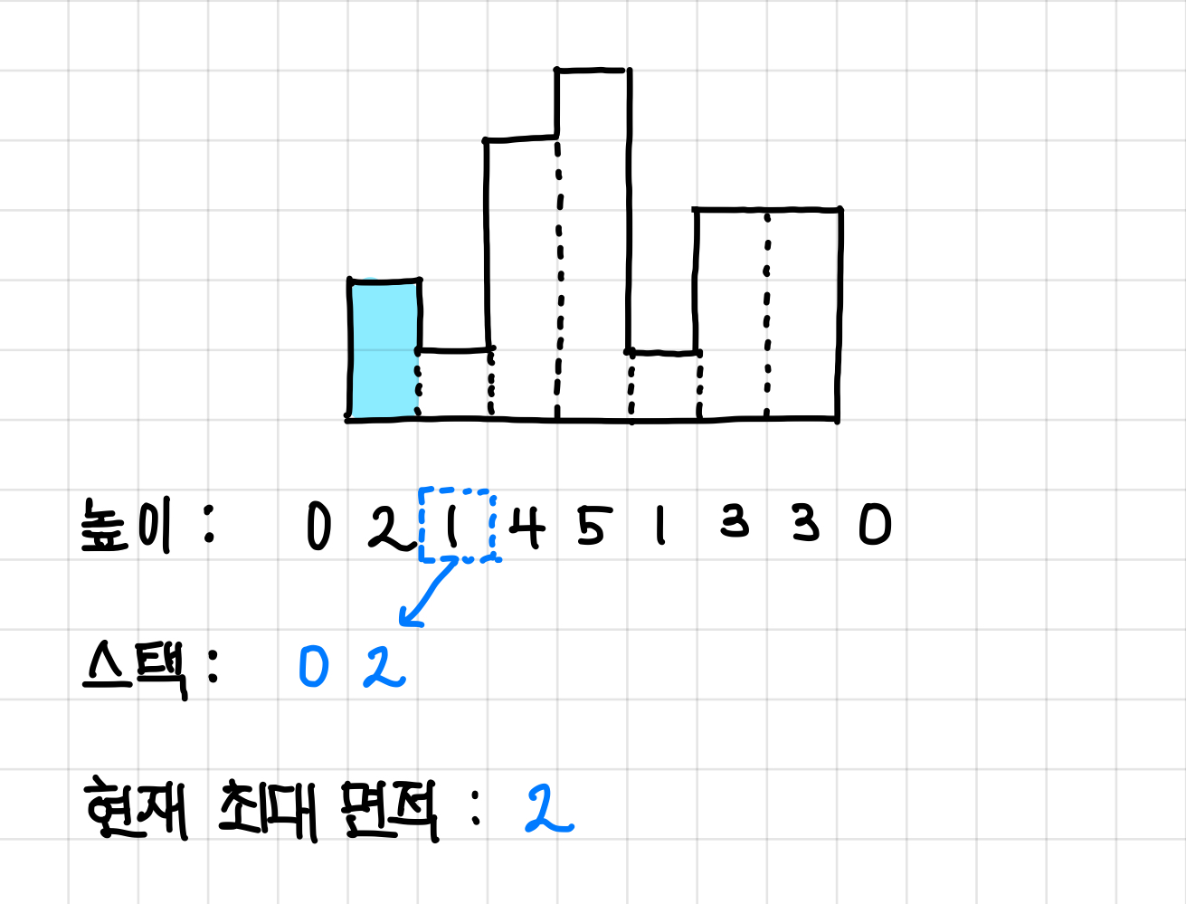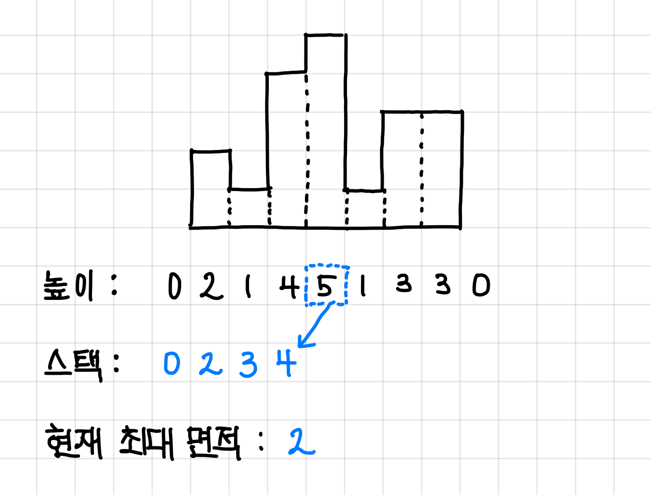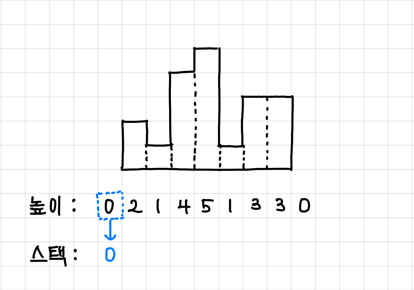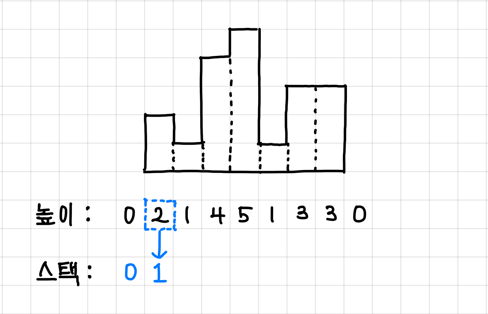 (실제 스택에는 인덱스가 들어가고, 그 인덱스에 해당하는 높이 값이 증가하는 방향으로 쌓인다는 것이다.)▼