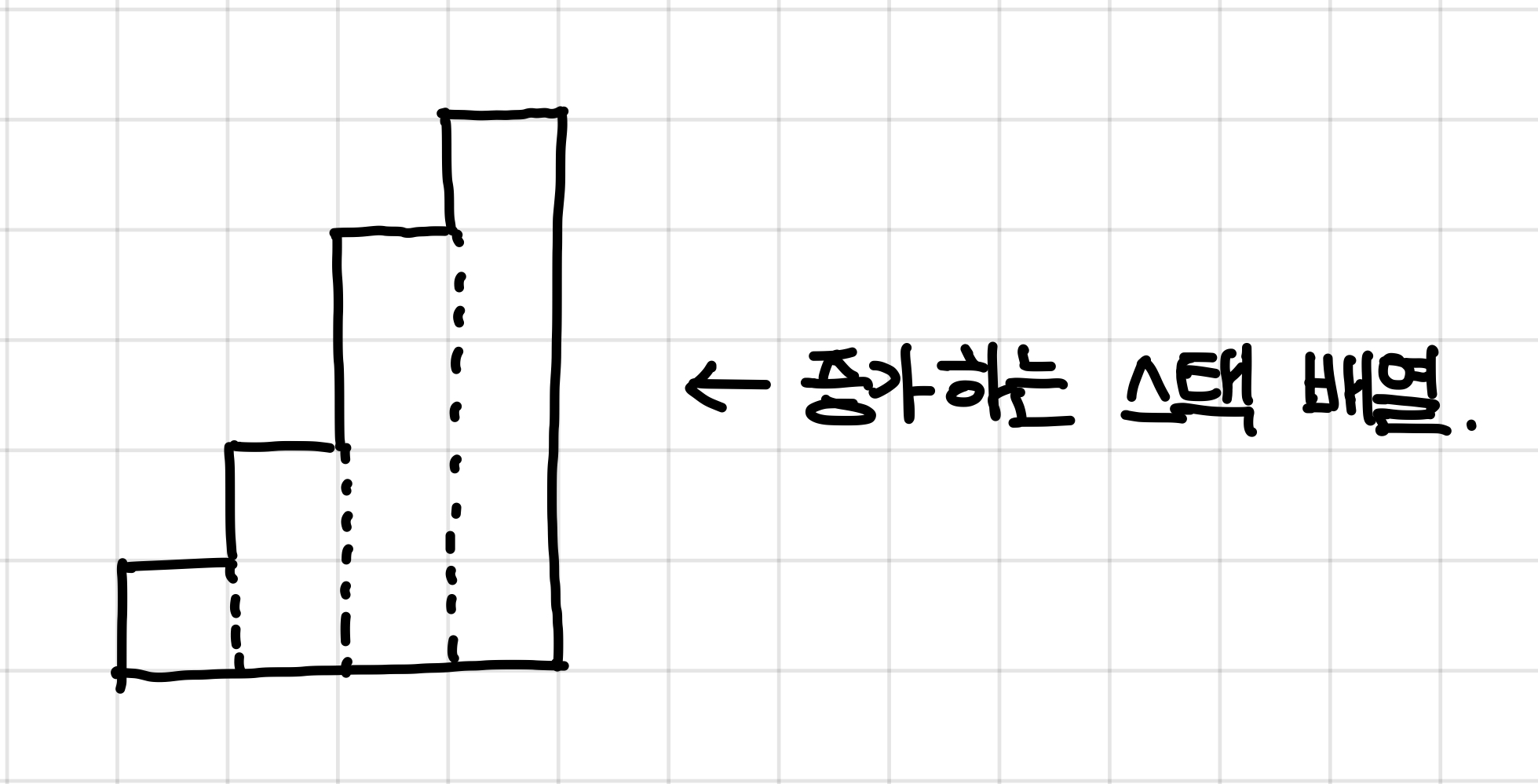왜 그런가하면, 1번과 2번의 내용대로 스택을 채워넣게 되면 아래 그림과 같이 스택에 증가하는 방향으로만 쌓일 것이다.