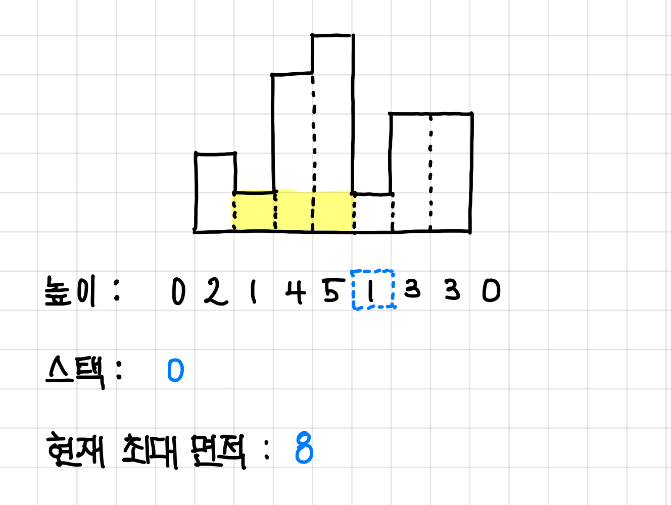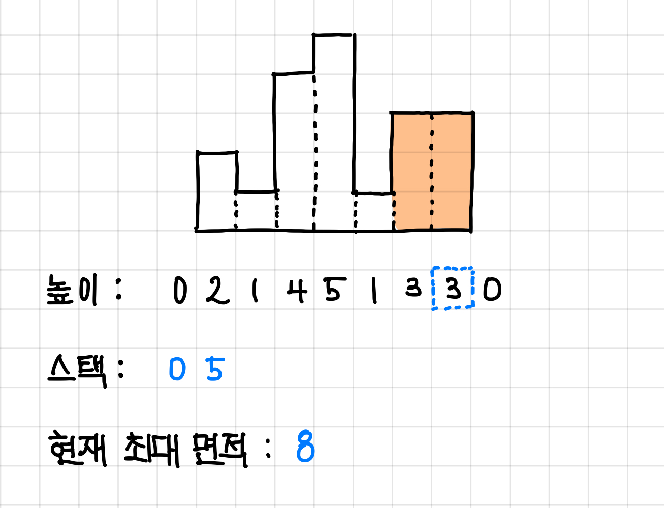 그래서 다시 원래 예제로 돌아오면, 방금 면적은 pop()된 스택 값(인덱스)에 해당하는 높이에서 나올 수 있는 최대값이 되고, 현재 높이 값보다 작은 값들의 인덱스가 전부 pop() 됐다면 이제 현재 높이 값의 인덱스를 넣어준다.▼
