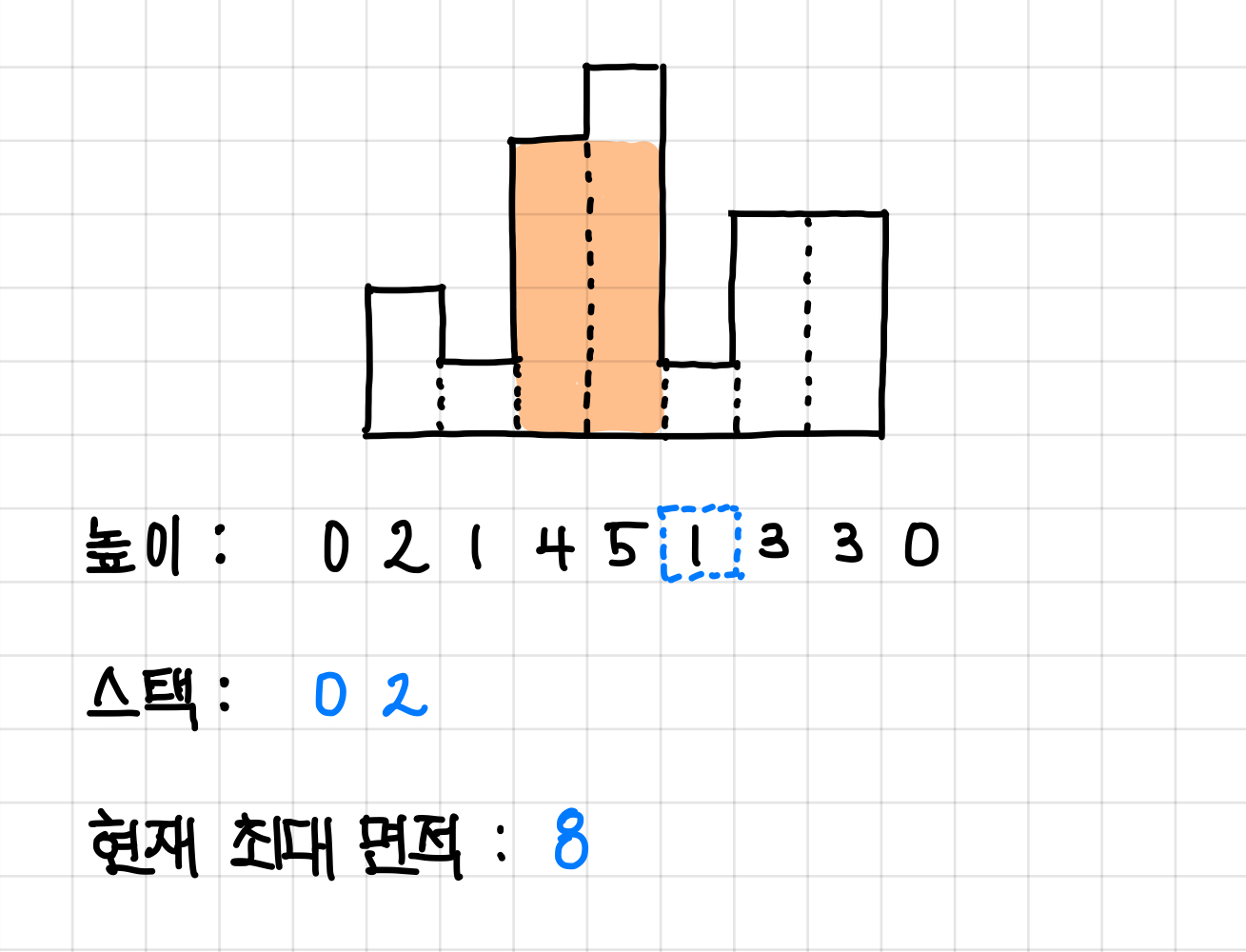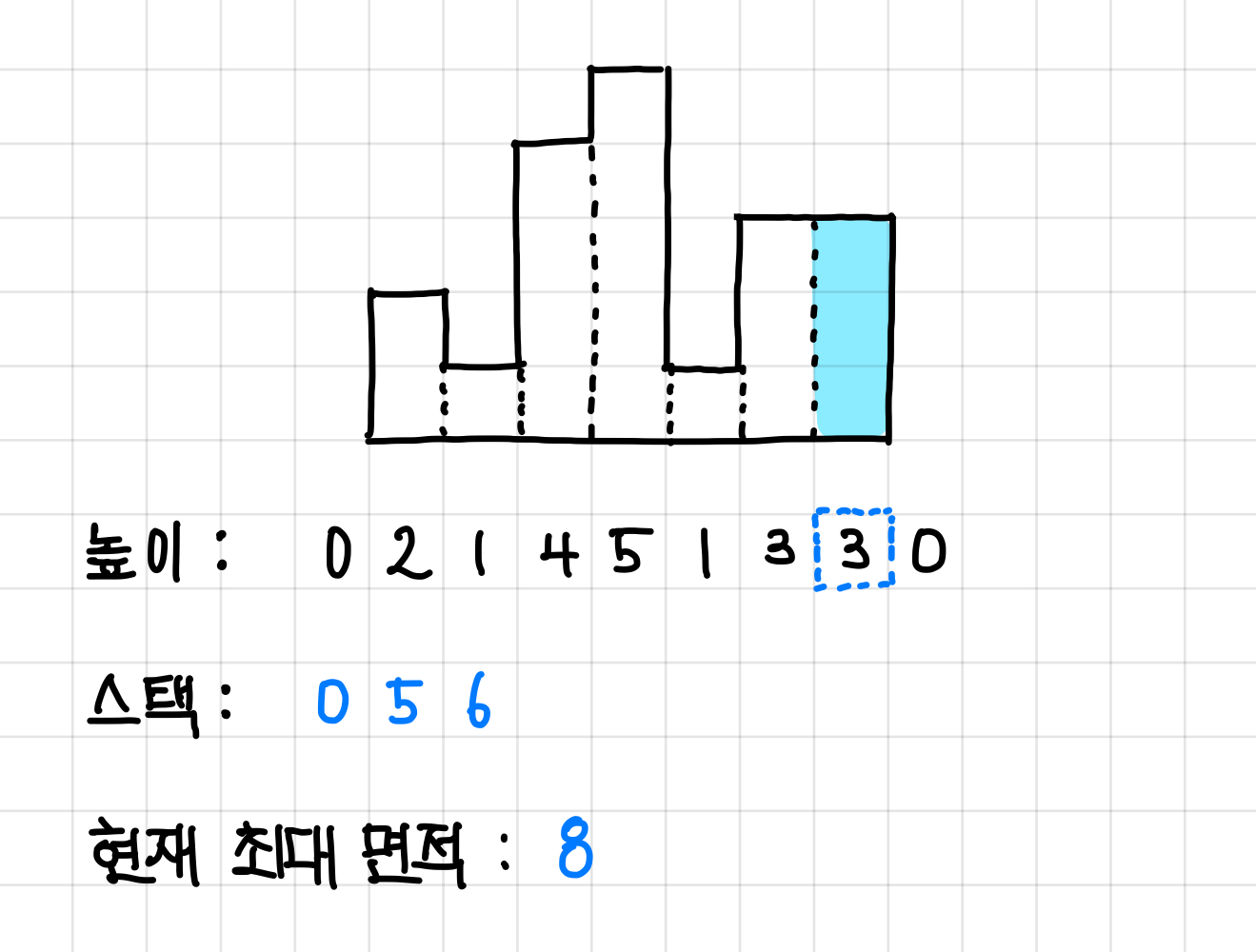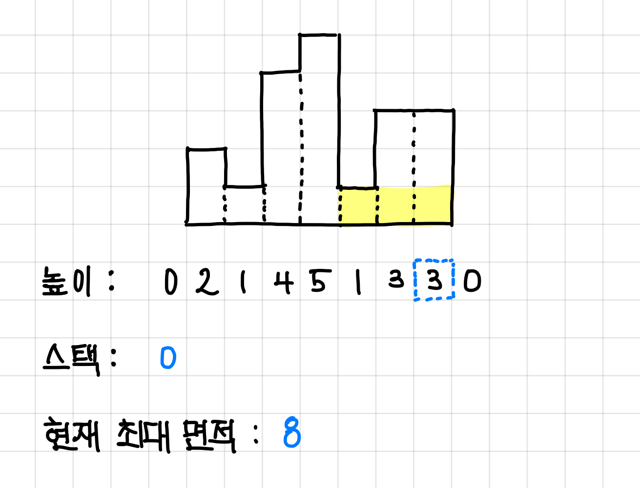 그래서 다시 원래 예제로 돌아오면, 방금 면적은 pop()된 스택 값(인덱스)에 해당하는 높이에서 나올 수 있는 최대값이 되고, 현재 높이 값보다 작은 값들의 인덱스가 전부 pop() 됐다면 이제 현재 높이 값의 인덱스를 넣어준다.▼