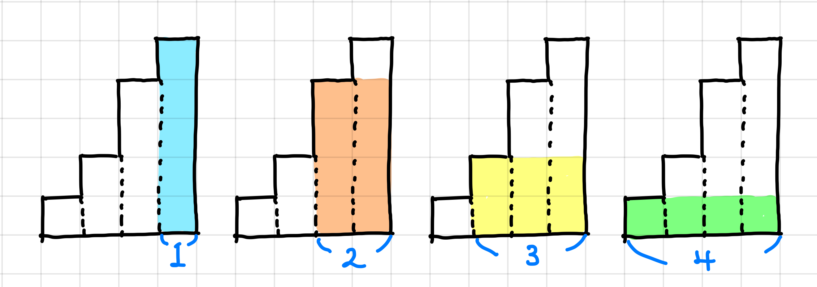 하지만 우리는 오름차순으로 스택을 정렬해놨기 때문에, top으로 부터 현재 자기 인덱스까지의 원소 수만큼의 가로 길이를 갖게 된다.▼