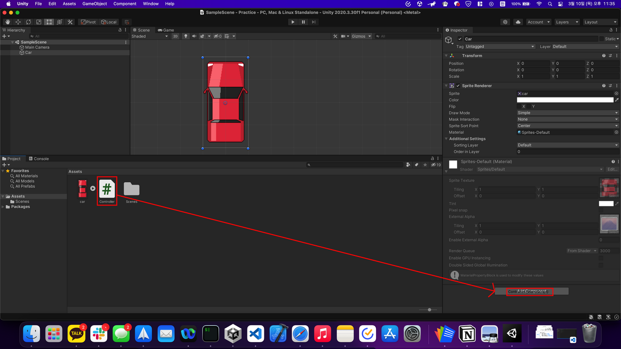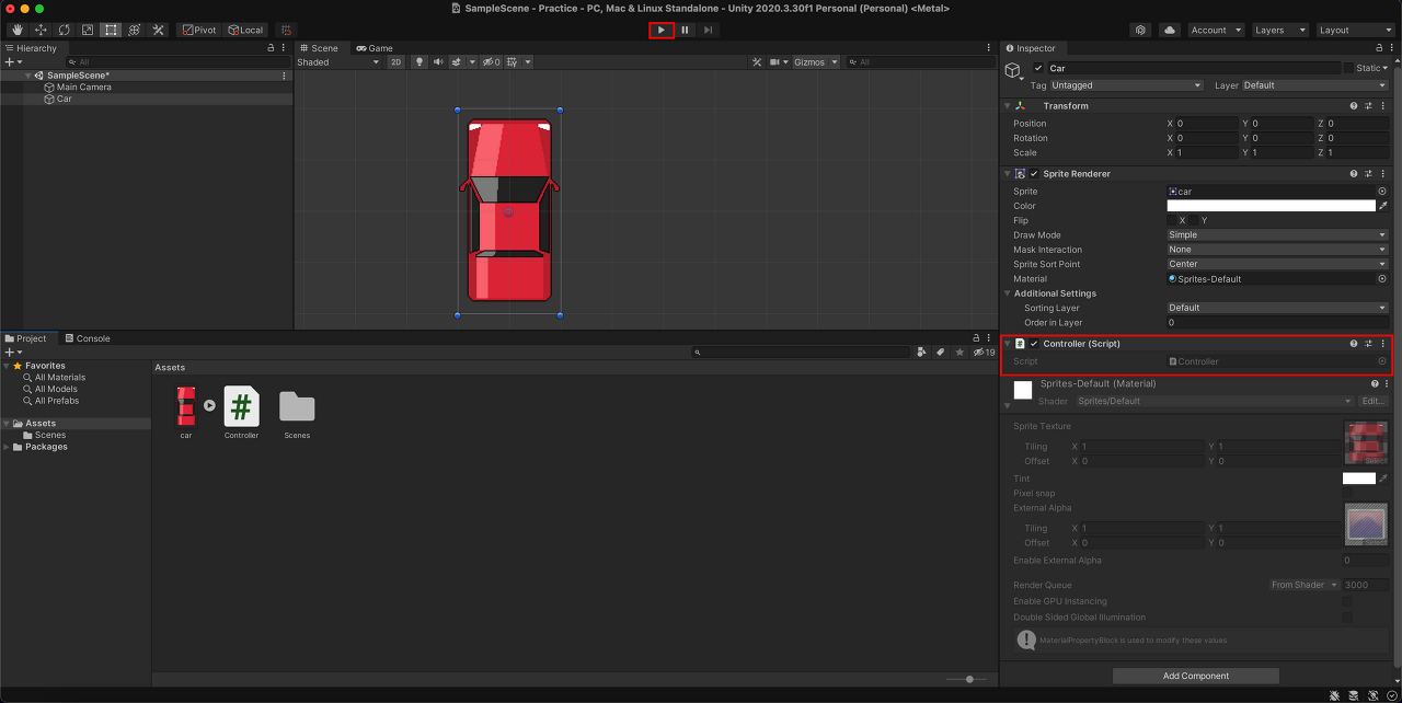 컴파일이 완료되면 스크립트를 Car 오브젝트에 드래그 앤 드랍하여 컴포넌트로 넣어주자.