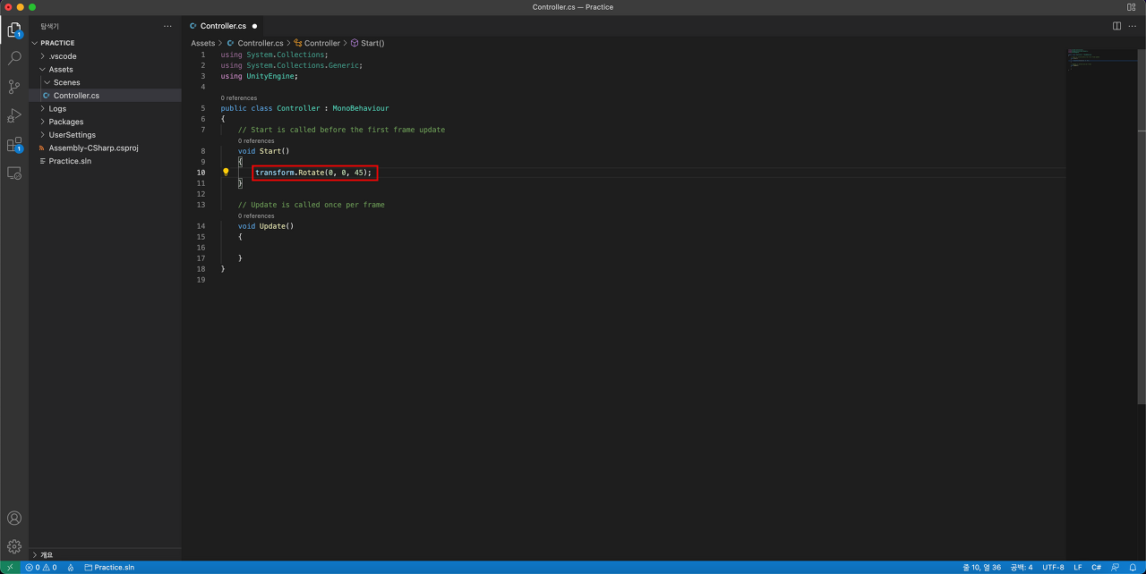 - `transform.Rotate()`오브젝트의 회전 상태를 바꿔준다.