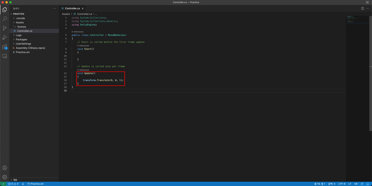 - `transform.Translate()` 오브젝트의 좌표 상태를 바꿔준다.